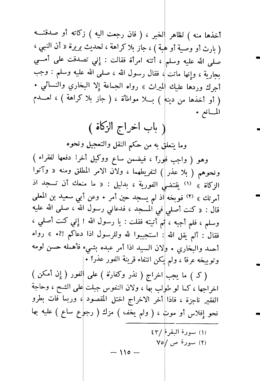 (بَابُ إخْرَاجِ الزَّكَاةِ) وَمَا يَتَعَلَّقُ بِهِ مِنْ حُكْمِ النَّقْلِ وَالتَّعْجِيلِ وَنَحْوِهِ وَهُوَ (وَاجِبٌ فَوْرًا، فَيَضْمَنُ سَاعٍ وَوَكِيلٌ أَخَّرَا دَفْعَهَا لِفُقَرَاءَ) وَنَحْوِهِمْ (بِلَا عُذْرٍ) لِتَفْرِيطِهِمَا، وَلِأَنَّ الْأَمْرَ الْمُطْلَقَ وَمِنْهُ {وَآتُوا الزَّكَاةَ} [البقرة: 43] ، يَقْتَضِي الْفَوْرِيَّةَ، بِدَلِيلِ:. {مَا مَنَعَكَ أَلا تَسْجُدَ إِذْ أَمَرْتُكَ} [الأعراف: 12] فَوَبَّخَهُ إذْ لَمْ يَسْجُدْ حِينَ أُمِرَ. وَعَنْ أَبِي سَعِيدِ بْنِ الْمُعَلَّى قَالَ: «كُنْتُ أُصَلِّي فِي الْمَسْجِدِ، فَدَعَانِي رَسُولُ اللَّهِ - صَلَّى اللَّهُ عَلَيْهِ وَسَلَّمَ - فَلَمْ أُجِبْهُ، ثُمَّ أَتَيْتُهُ فَقُلْتُ: يَا رَسُولَ اللَّهِ، إنِّي كُنْتُ أُصَلِّي، فَقَالَ: أَلَمْ يَقُلْ اللَّهُ {اسْتَجِيبُوا لِلَّهِ وَلِلرَّسُولِ إِذَا دَعَاكُمْ} [الأنفال: 24] ،؟» . رَوَاهُ أَحْمَدُ وَالْبُخَارِيُّ. وَلِأَنَّ السَّيِّدَ إذَا أَمَرَ عَبْدَهُ بِشَيْءٍ فَأَهْمَلَهُ حَسُنَ لَوْمُهُ وَتَوْبِيخُهُ عُرْفًا، وَلَمْ يَكُنْ انْتِفَاءُ قَرِينَةِ الْفَوْرِ عُذْرًا. (كَ) مَا يَجِبُ إخْرَاجُ (نَذْرٍ وَكَفَّارَةٍ) عَلَى الْفَوْرِ (إنْ أَمْكَنَ) إخْرَاجُهَا، كَمَا لَوْ طُولِبَ بِهَا، وَلِأَنَّ النُّفُوسَ جُبِلَتْ عَلَى الشُّحِّ، وَحَاجَةُ الْفَقِيرِ نَاجِزَةٌ، فَإِذَا أُخِّرَ الْإِخْرَاجُ اخْتَلَّ الْمَقْصُودُ، وَرُبَّمَا فَاتَ بِطُرُوِّ نَحْوِ إفْلَاسٍ أَوْ مَوْتٍ، (وَلَمْ يَخَفْ) مُزَكٍّ (رُجُوعَ سَاعٍ) عَلَيْهِ بِهَا