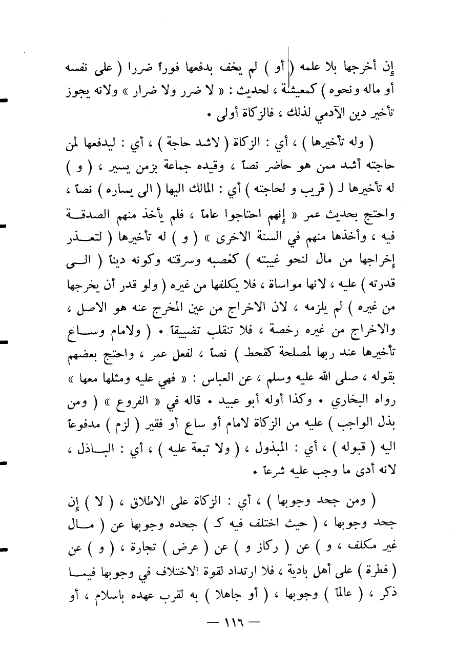 إنْ أَخْرَجَهَا بِلَا عِلْمِهِ (أَوْ) لَمْ يَخَفْ بِدَفْعِهَا فَوْرًا ضَرَرًا (عَلَى نَفْسِهِ أَوْ مَالِهِ وَنَحْوِهِ) كَمَعِيشَةٍ، لِحَدِيثِ: «لَا ضَرَرَ وَلَا ضِرَارَ» ، وَلِأَنَّهُ يَجُوزُ تَأْخِيرُ دَيْنِ الْآدَمِيِّ لِذَلِكَ، فَالزَّكَاةُ أَوْلَى.