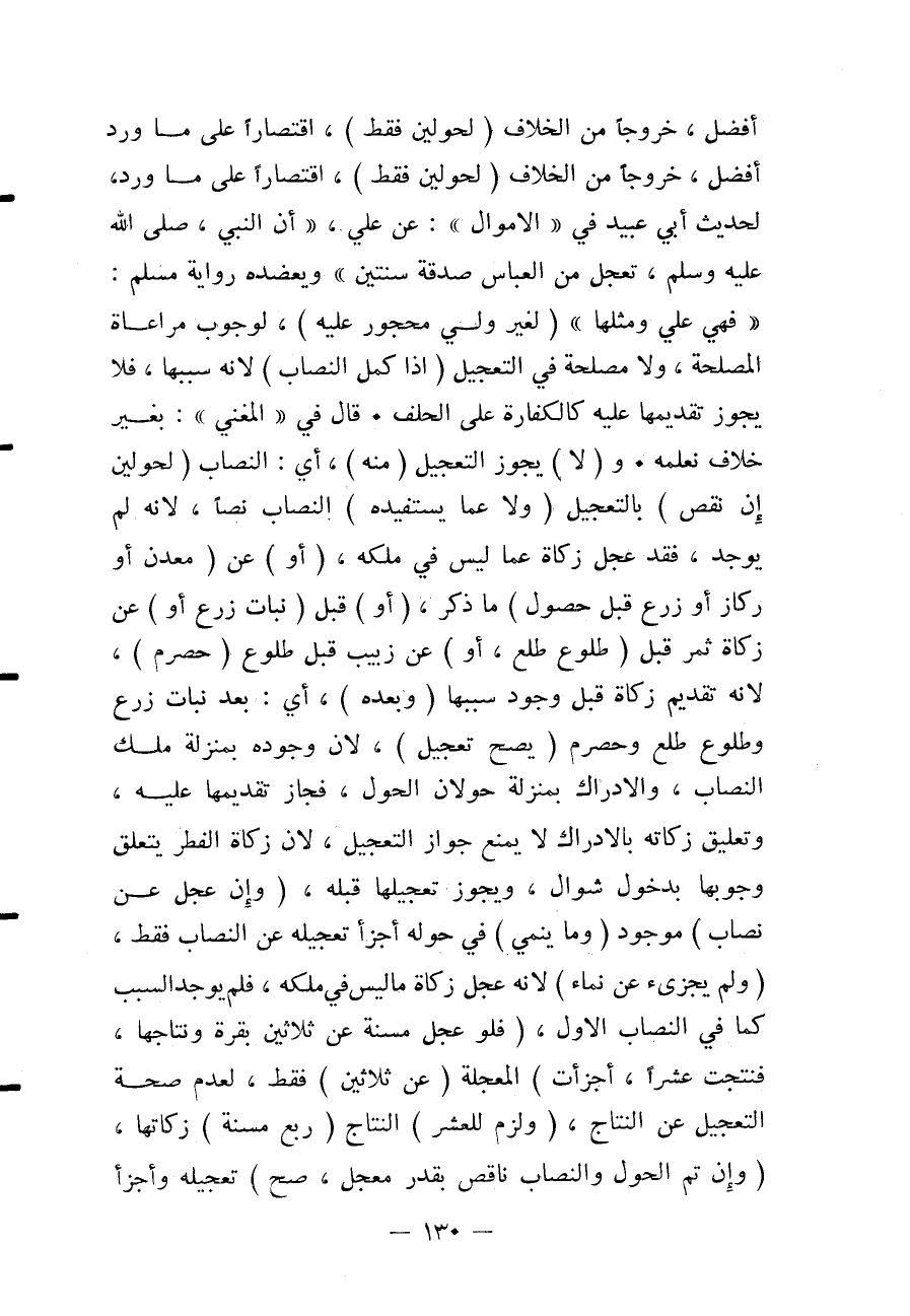 أَفْضَلُ، خُرُوجًا مِنْ الْخِلَافِ (لِحَوْلَيْنِ فَقَطْ) ، اقْتِصَارًا عَلَى مَا وَرَدَ أَفْضَلُ، خُرُوجًا مِنْ الْخِلَافِ (لِحَوْلَيْنِ فَقَطْ) ، اقْتِصَارًا عَلَى مَا وَرَدَ، لِحَدِيثِ أَبِي عُبَيْدٍ فِي " الْأَمْوَالِ ": عَنْ عَلِيٍّ، «أَنَّ النَّبِيَّ - صَلَّى اللَّهُ عَلَيْهِ وَسَلَّمَ - تَعَجَّلَ مِنْ الْعَبَّاسِ صَدَقَةَ سَنَتَيْنِ» وَيُعَضِّدُهُ رِوَايَةُ مُسْلِمٌ: " فَهِيَ عَلَيَّ وَمِثْلُهَا " (لِغَيْرِ وَلِيٍّ مَحْجُورٍ عَلَيْهِ) ، لِوُجُوبِ مُرَاعَاةِ الْمَصْلَحَةِ، وَلَا مَصْلَحَةَ فِي التَّعْجِيلِ (إذَا كَمُلَ النِّصَابُ) لِأَنَّهُ سَبَبُهَا، فَلَا يَجُوزُ تَقْدِيمُهَا عَلَيْهِ كَالْكَفَّارَةِ عَلَى الْحَلِفِ. قَالَ فِي الْمُغْنِي ": بِغَيْرِ خِلَافٍ نَعْلَمُهُ.