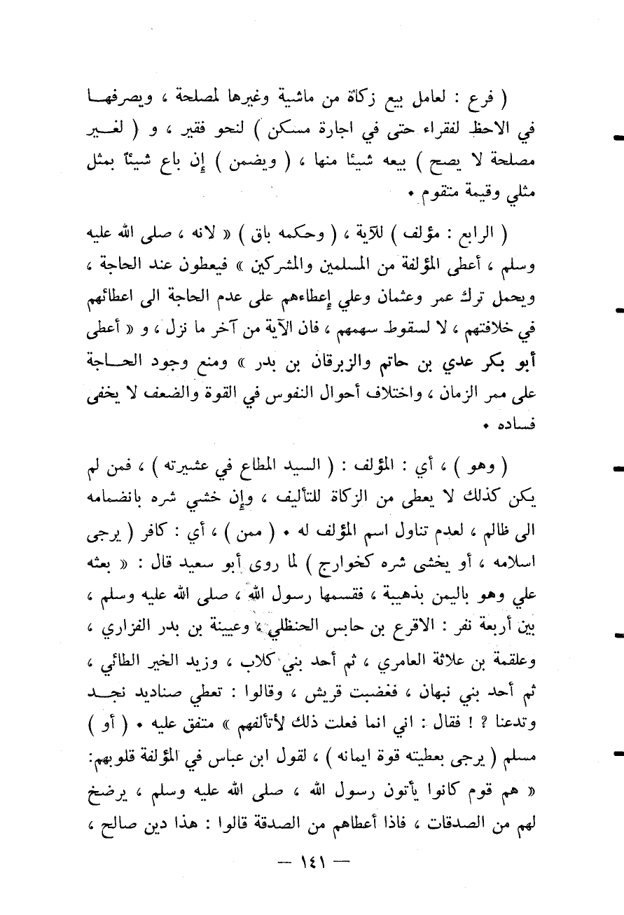 (الرَّابِعُ: مُؤَلَّفٌ) لِلْآيَةِ، (وَحُكْمُهُ بَاقٍ) " لِأَنَّهُ - صَلَّى اللَّهُ عَلَيْهِ وَسَلَّمَ - أَعْطَى الْمُؤَلَّفَةَ مِنْ الْمُسْلِمِينَ وَالْمُشْرِكِينَ، فَيُعْطَوْنَ عِنْدَ الْحَاجَةِ، وَيُحْمَلُ تَرْكُ عُمَرَ وَعُثْمَانَ وَعَلِيٍّ إعْطَاءَهُمْ عَلَى عَدَمِ الْحَاجَةِ إلَى إعْطَائِهِمْ فِي خِلَافَتِهِمْ، لَا لِسُقُوطٍ سَهْمِهِمْ، فَإِنَّ الْآيَةَ مِنْ آخِرِ مَا نَزَلَ، وَ " أَعْطَى أَبُو بَكْرٍ عَدِيَّ بْنَ حَاتِمٍ وَالزِّبْرِقَانَ بْنَ بَدْرٍ، وَمَنَعَ وُجُودَ الْحَاجَةِ عَلَى مَمَرِّ الزَّمَانِ، وَاخْتِلَافُ أَحْوَالِ النُّفُوسِ فِي الْقُوَّةِ وَالضَّعْفِ لَا يُخْفِي فَسَادَهُ. (وَهُوَ) ، أَيْ: الْمُؤَلَّفُ: (السَّيِّدُ الْمُطَاعُ فِي عَشِيرَتِهِ) ، فَمَنْ لَمْ يَكُنْ كَذَلِكَ لَا يُعْطَى مِنْ الزَّكَاةِ لِلتَّأْلِيفِ، وَإِنْ خُشِيَ شَرُّهُ بِانْضِمَامِهِ إلَى ظَالِمٍ، لِعَدَمِ تَنَاوُلِ اسْمِ الْمُؤَلَّفِ لَهُ. (مِمَّنْ) ، أَيْ: كَافِرٍ (يُرْجَى إسْلَامُهُ، أَوْ يُخْشَى شَرُّهُ كَخَوَارِجَ) لِمَا رَوَى أَبُو سَعِيدٍ قَالَ: «بَعَثَهُ عَلِيٌّ وَهُوَ بِالْيَمَنِ بِذُهَيْبَةٍ، فَقَسَمَهَا رَسُولُ اللَّهِ - صَلَّى اللَّهُ عَلَيْهِ وَسَلَّمَ - بَيْنَ أَرْبَعَةِ نَفَرٍ: الْأَقْرَعِ بْنِ حَابِسٍ الْحَنْظَلِيِّ، وَعُيَيْنَةَ بْنِ بَدْرٍ الْفَزَارِيِّ، وَعَلْقَمَةَ بْنِ عُلَاثَةَ الْعَامِرِيِّ، ثُمَّ أَحَدِ بَنِي كِلَابٍ، وَزَيْدِ الْخَيْرِ الطَّائِيِّ، ثُمَّ أَحَدِ بَنِي نَبْهَانَ، فَغَضِبَتْ قُرَيْشٌ، وَقَالُوا: تُعْطِي صَنَادِيدَ نَجْدٍ وَتَدَعُنَا؟ فَقَالَ: إنِّي إنَّمَا فَعَلْتُ ذَلِكَ لِأَتَأَلَّفَهُمْ» مُتَّفَقٌ عَلَيْهِ. (أَوْ) مُسْلِمٌ (يُرْجَى بِعَطِيَّتِهِ قُوَّةُ إيمَانِهِ) ، لِقَوْلِ ابْنِ عَبَّاسٍ فِي الْمُؤَلَّفَةِ قُلُوبُهُمْ: " هُمْ قَوْمٌ كَانُوا يَأْتُونَ رَسُولَ اللَّهِ - صَلَّى اللَّهُ عَلَيْهِ وَسَلَّمَ - يُرْضِخُ لَهُمْ مِنْ الصَّدَقَاتِ، فَإِذَا أَعْطَاهُمْ مِنْ الصَّدَقَةِ قَالُوا: هَذَا دِينٌ صَالِحٌ،