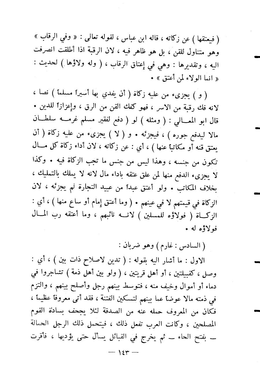 (فَيُعْتِقُهَا) عَنْ زَكَاتِهِ، قَالَهُ ابْنُ عَبَّاسٍ لِقَوْلِهِ تَعَالَى {وَفِي الرِّقَابِ} [التوبة: 60] وَهُوَ مُتَنَاوِلٌ لِلْقِنِّ، بَلْ هُوَ ظَاهِرٌ فِيهِ، لِأَنَّ الرَّقَبَةَ إذَا أُطْلِقَتْ انْصَرَفَتْ إلَيْهِ، وَتَقْدِيرُهَا: وَهِيَ فِي إعْتَاقِ الرِّقَابِ، (وَلَهُ وَلَاؤُهَا) لِحَدِيثِ: «إنَّمَا الْوَلَاءُ لِمَنْ أَعْتَقَ» . (وَ) يُجْزِئُ مَنْ عَلَيْهِ زَكَاةٌ (أَنْ يَفْدِيَ بِهَا أَسِيرًا مُسْلِمًا) نَصًّا، لِأَنَّهُ فَكُّ رَقَبَةٍ مِنْ الْأَسْرِ، فَهُوَ كَفَكِّ الْقِنِّ مِنْ الرِّقِّ، وَإِعْزَازًا لِلدِّينِ. قَالَ أَبُو الْمَعَالِي: (وَمِثْلُهُ) لَوْ (دَفَعَ لِفَقِيرٍ مُسْلِمٍ غَرَّمَهُ سُلْطَانٌ مَالًا لِيَدْفَعَ جَوْرَهُ) ، فَيُجْزِئُهُ. وَ (لَا) يُجْزِئُ مَنْ عَلَيْهِ زَكَاةٌ (أَنْ يُعْتِقَ قِنَّهُ أَوْ مُكَاتَبًا عَنْهَا) ، أَيْ: عَنْ زَكَاتِهِ، لِأَنَّ أَدَاءَ زَكَاةِ كُلِّ مَالٍ تَكُونُ مِنْ جِنْسِهِ، وَهَذَا لَيْسَ مِنْ جِنْسِ مَا تَجِبُ الزَّكَاةُ فِيهِ. وَكَذَا لَا يُجْزِئُ الدَّفْعُ مِنْهَا لِمَنْ عَلَّقَ عِتْقَهُ بِأَدَاءِ مَالٍ لِأَنَّهُ لَا يَمْلِكُ بِالتَّمْلِيكِ، بِخِلَافِ الْمُكَاتَبِ. وَلَوْ أَعْتَقَ عَبْدًا مِنْ عَبِيدِ التِّجَارَةِ لَمْ يُجْزِئْهُ، لِأَنَّ الزَّكَاةَ فِي قِيمَتِهِمْ لَا فِي عَيْنِهِمْ. (وَمَا أَعْتَقَ إمَامٌ أَوْ سَاعٍ مِنْهَا) ، أَيْ: الزَّكَاةِ (فَوَلَاؤُهُ لِلْمُسْلِمِينَ) لِأَنَّهُ نَائِبُهُمْ، وَمَا أَعْتَقَهُ رَبُّ الْمَالِ فَوَلَاؤُهُ لَهُ.