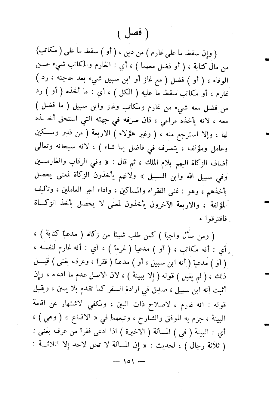 (وَمَنْ سَأَلَ وَاجِبًا) كَمَنْ طَلَبَ شَيْئًا مِنْ زَكَاةٍ (مُدَّعِيًا كِتَابَةً) ، أَيْ: أَنَّهُ مُكَاتَبٌ، (أَوْ) مُدَّعِيًا (غُرْمًا) ، أَيْ: أَنَّهُ غَارِمٌ لِنَفْسِهِ، (أَوْ) مُدَّعِيًا (أَنَّهُ ابْنُ سَبِيلٍ، أَوْ) مُدَّعِيًا (فَقْرًا، وَعُرِفَ بِغِنًى) قَبْلَ ذَلِكَ، (لَمْ يُقْبَلْ) قَوْلُهُ (إلَّا بِبَيِّنَةٍ) ، لِأَنَّ الْأَصْلَ عَدَمُ مَا ادَّعَاهُ، وَإِنْ أَثْبَتَ أَنَّهُ ابْنُ سَبِيلٍ، صُدِّقَ فِي إرَادَةِ السَّفَرِ كَمَا تَقَدَّمَ بِلَا يَمِينٍ، وَيُقْبَلُ قَوْلُهُ: إنَّهُ غَارِمٌ، لِإِصْلَاحِ ذَاتِ الْبَيْنِ، وَيَكْفِي الِاشْتِهَارُ عَنْ إقَامَةِ الْبَيِّنَةِ، جَزَمَ بِهِ الْمُوَفَّقُ وَالشَّارِحُ، وَتَبِعَهُمَا فِي: " الْإِقْنَاعِ " (وَهِيَ) ، أَيْ: الْبَيِّنَةُ (فِي) الْمَسْأَلَةِ (الْأَخِيرَةِ) إذَا ادَّعَى فَقْرًا مَنْ عُرِفَ بِغِنًى: (ثَلَاثَةُ رِجَالٍ) ، لِحَدِيثِ: «إنَّ الْمَسْأَلَةَ لَا تَحِلُّ لِأَحَدٍ إلَّا لِثَلَاثَةٍ: