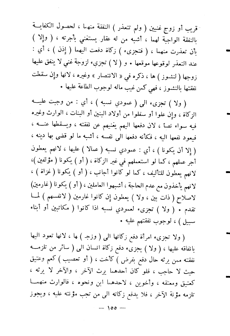(وَلَا) يُجْزِئُ دَفْعُ زَكَاةِ إنْسَانٍ إلَى (سَائِرِ مَنْ تَلْزَمُهُ نَفَقَتُهُ مِمَّنْ يَرِثُهُ حَالَ دَفْعٍ بِفَرْضٍ) كَأُخْتٍ، (أَوْ تَعْصِيبٍ) كَعَمٍّ وَعَتِيقٍ حَيْثُ لَا حَاجِبَ، فَلَوْ كَانَ أَحَدُهُمَا يَرِثُ الْآخَرَ، وَالْآخَرُ لَا يَرِثُهُ، كَعَتِيقٍ وَمُعْتِقِهِ، وَأَخَوَيْنِ، لِأَحَدِهِمَا ابْنٌ وَنَحْوُهُ، فَالْوَارِثُ مِنْهُمَا تَلْزَمُهُ مُؤْنَةُ الْآخَرِ، فَلَا يَدْفَعُ زَكَاتَهُ إلَى مَنْ تَجِبُ مُؤْنَتُهُ عَلَيْهِ، وَيَجُوزُ