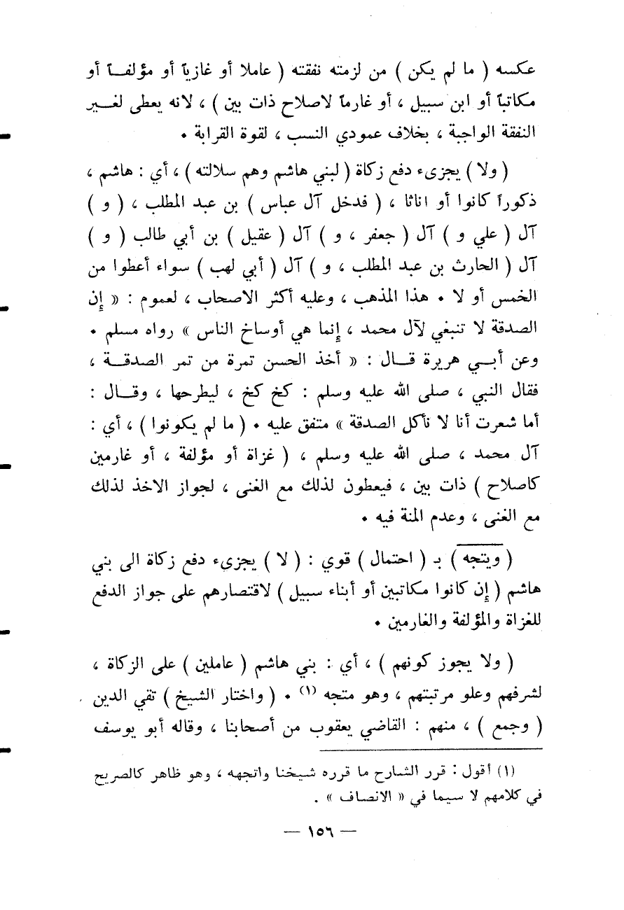 (وَلَا) يُجْزِئُ دَفْعُ زَكَاةٍ (لِبَنِي هَاشِمٍ وَهُمْ سُلَالَتُهُ) ، أَيْ: هَاشِمٍ، ذُكُورًا كَانُوا أَوْ إنَاثًا، (فَدَخَلَ آلُ عَبَّاسٍ) بْنِ عَبْدِ الْمُطَّلِبِ، (وَ) آلُ (عَلِيٍّ وَ) آلُ (جَعْفَرٍ وَ) آلُ (عَقِيلٍ) بْنِ أَبِي طَالِبٍ (وَ) آلُ (الْحَارِثِ بْنِ عَبْدِ الْمُطَّلِبِ وَ) آلُ (أَبِي لَهَبٍ) سَوَاءٌ أُعْطُوا مِنْ الْخُمُسِ أَوْ لَا. هَذَا الْمَذْهَبُ، وَعَلَيْهِ أَكْثَرُ الْأَصْحَابِ، لِعُمُومِ: «إنَّ الصَّدَقَةَ لَا تَنْبَغِي لِآلِ مُحَمَّدٍ، إنَّمَا هِيَ أَوْسَاخُ النَّاسِ» رَوَاهُ مُسْلِمٌ. وَعَنْ أَبِي هُرَيْرَةَ قَالَ: «أَخَذَ الْحَسَنُ تَمْرَةً مِنْ تَمْرِ الصَّدَقَةِ، فَقَالَ النَّبِيُّ - صَلَّى اللَّهُ عَلَيْهِ وَسَلَّمَ -: كِخْ كِخْ، لِيَطْرَحَهَا، وَقَالَ: أَمَا شَعَرْتَ أَنَّا لَا نَأْكُلُ الصَّدَقَةَ» مُتَّفَقٌ عَلَيْهِ. (مَا لَمْ يَكُونُوا) ، أَيْ: آلُ مُحَمَّدٍ - صَلَّى اللَّهُ عَلَيْهِ وَسَلَّمَ - (غُزَاةً أَوْ مُؤَلَّفَةً، أَوْ غَارِمِينَ كَإِصْلَاحِ) ذَاتِ بَيْنٍ، فَيُعْطُونَ لِذَلِكَ مَعَ الْغِنَى، لِجَوَازِ الْأَخْذِ لِذَلِكَ مَعَ الْغِنَى، وَعَدَمِ الْمِنَّةِ فِيهِ. (وَيَتَّجِهُ) بِ (احْتِمَالٍ) قَوِيٍّ: (لَا) يُجْزِئُ دَفْعُ زَكَاةٍ إلَى بَنِي هَاشِمٍ (إنْ كَانُوا مُكَاتَبِينَ أَوْ أَبْنَاءَ سَبِيلٍ) لِاقْتِصَارِهِمْ عَلَى جَوَازِ الدَّفْعِ لِلْغُزَاةِ وَالْمُؤَلَّفَةِ وَالْغَارِمِينَ. (وَلَا يَجُوزُ كَوْنُهُمْ) ، أَيْ: بَنِي هَاشِمٍ (عَامِلِينَ) عَلَى الزَّكَاةِ، لِشَرَفِهِمْ وَعُلُوِّ مَرْتَبَتِهِمْ، وَهُوَ مُتَّجِهٌ. (وَاخْتَارَ الشَّيْخُ) تَقِيُّ الدِّينِ (وَجَمْعٌ) ، مِنْهُمْ: الْقَاضِي يَعْقُوبُ مِنْ أَصْحَابِنَا، وَقَالَهُ أَبُو يُوسُفَ الْإِصْطَخْرِيُّ