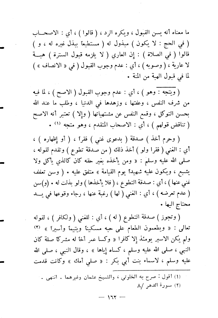 مَا مَعْنَاهُ أَنَّهُ يُسَنُّ الْقَبُولُ، وَيُكْرَهُ الرَّدُّ، (قَالُوا) ، أَيْ: الْأَصْحَابُ (فِي الْحَجِّ: لَا يَكُونُ) مَبْذُولٌ لَهُ (مُسْتَطِيعًا بِبَذْلِ غَيْرِهِ لَهُ، وَ) قَالُوا (فِي الصَّلَاةِ) : إنَّ الْعَارِيَ (لَا يَلْزَمُهُ قَبُولُ السُّتْرَةِ) هِبَةً لَا عَارِيَّةً، (وَصَوَّبَهُ) ، أَيْ: عَدَمَ وُجُوبِ الْقَبُولِ (فِي " الْإِنْصَافِ ") لِمَا فِي قَبُولِ الْهِبَةِ مِنْ الْمِنَّةِ. (وَيُتَّجَهُ: وَهُوَ) ، أَيْ: عَدَمُ وُجُوبِ الْقَبُولِ (الْأَصَحُّ) ، لِمَا فِيهِ مِنْ شَرَفِ النَّفْسِ، وَعِفَّتِهَا، وَزُهْدِهَا فِي الدُّنْيَا، وَطَلَبِ مَا عِنْدَ اللَّهِ بِحُسْنِ التَّوَكُّلِ، وَقَمْعِ النَّفْسِ عَنْ مُشْتَهَيَاتِهَا (وَإِلَّا) تُعْتَبَرْ أَنَّهُ الْأَصَحُّ (تَنَاقَضَ قَوْلُهُمْ) ، أَيْ: الْأَصْحَابِ الْمُتَقَدِّمُ، وَهُوَ مُتَّجِهٌ.