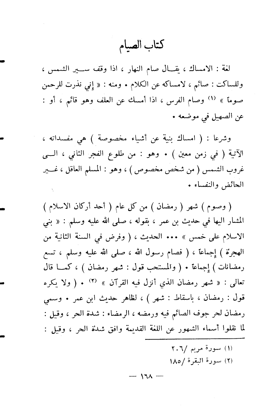 ِ لُغَةً: الْإِمْسَاكُ، يُقَالُ صَامَ النَّهَارُ، إذَا وَقَفَ سَيْرُ الشَّمْسِ، وَلِلسَّاكِتِ: صَائِمٌ، لِإِمْسَاكِهِ عَنْ الْكَلَامِ. وَمِنْهُ: {إِنِّي نَذَرْتُ لِلرَّحْمَنِ صَوْمًا} [مريم: 26] ، وَصَامَ الْفَرَسُ، إذَا أَمْسَكَ عَنْ الْعَلَفِ وَهُوَ قَائِمٌ، أَوْ: عَنْ الصَّهِيلِ فِي مَوْضِعِهِ. وَشَرْعًا: (إمْسَاكٌ بِنِيَّةٍ عَنْ أَشْيَاءَ مَخْصُوصَةٍ) هِيَ مُفْسِدَاتُهُ، الْآتِيَةُ (فِي زَمَنٍ مُعَيَّنٍ) . وَهُوَ: مِنْ طُلُوعِ الْفَجْرِ الثَّانِي، إلَى غُرُوبِ الشَّمْسِ (مِنْ شَخْصٍ مَخْصُوصٍ) ، وَهُوَ: الْمُسْلِمُ الْعَاقِلُ، غَيْرُ الْحَائِضِ وَالنُّفَسَاءِ. (وَصَوْمُ) شَهْرِ (رَمَضَانَ) مِنْ كُلِّ عَامٍ (أَحَدُ أَرْكَانِ الْإِسْلَامِ) الْمُشَارِ إلَيْهَا فِي حَدِيثِ ابْنِ عُمَرَ، بِقَوْلِهِ - صَلَّى اللَّهُ عَلَيْهِ وَسَلَّمَ -: «بُنِيَ الْإِسْلَامُ عَلَى خَمْسٍ» . . . الْحَدِيثُ (وَفُرِضَ فِي السَّنَةِ الثَّانِيَةِ مِنْ الْهِجْرَةِ) إجْمَاعًا، (فَصَامَ رَسُولُ اللَّهِ - صَلَّى اللَّهُ عَلَيْهِ وَسَلَّمَ - تِسْعَ رَمَضَانَاتٍ) إجْمَاعًا. (وَالْمُسْتَحَبُّ قَوْلُ: شَهْرُ رَمَضَانَ) ، كَمَا قَالَ تَعَالَى: {شَهْرُ رَمَضَانَ الَّذِي أُنْزِلَ فِيهِ الْقُرْآنُ} [البقرة: 185] . (وَلَا يُكْرَهُ قَوْلُ: رَمَضَانُ، بِإِسْقَاطِ: شَهْرٍ) ، لِظَاهِرِ حَدِيثِ ابْنِ عُمَرَ. وَسُمِّيَ رَمَضَانَ لِحَرِّ جَوْفِ الصَّائِمِ فِيهِ وَرَمَضِهِ، الرَّمْضَاءُ: شِدَّةُ الْحَرِّ، وَقِيلَ: لَمَّا نَقَلُوا أَسْمَاءَ الشُّهُورِ عَنْ اللُّغَةِ الْقَدِيمَةِ وَافَقَ شِدَّةَ الْحَرِّ، وَقِيلَ: