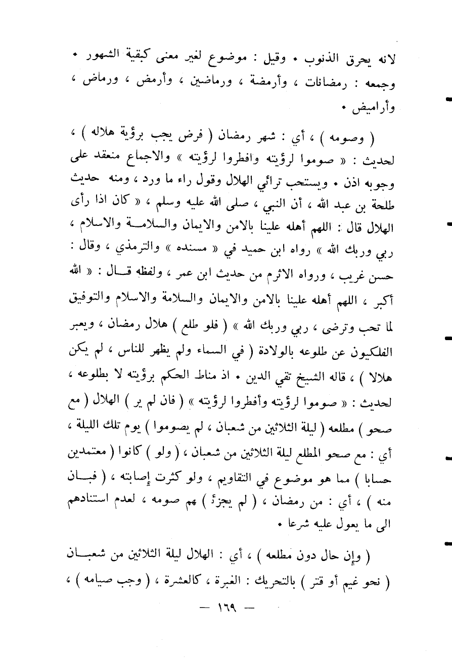 لِأَنَّهُ يَحْرُقُ الذُّنُوبَ. وَقِيلَ: مَوْضُوعٌ لِغَيْرِ مَعْنًى كَبَقِيَّةِ الشُّهُورِ. وَجَمْعُهُ: رَمَضَانَاتٌ، وَأَرْمِضَةٌ، وَرَمَاضِينُ، وَأَرْمُضٌ، وَرَمَاضٌ، وَأَرَامِيضُ. (وَصَوْمُهُ) ، أَيْ: شَهْرِ رَمَضَانَ (فَرْضٌ يَجِبُ بِرُؤْيَةِ هِلَالِهِ) ، لِحَدِيثِ: «صُومُوا لِرُؤْيَتِهِ وَأَفْطِرُوا لِرُؤْيَتِهِ» وَالْإِجْمَاعُ مُنْعَقِدٌ عَلَى وُجُوبِهِ إذَنْ. وَيُسْتَحَبُّ تَرَائِي الْهِلَالِ وَقَوْلُ رَاءٍ مَا وَرَدَ، وَمِنْهُ حَدِيثُ طَلْحَةَ بْنِ عَبْدِ اللَّهِ، أَنَّ النَّبِيَّ - صَلَّى اللَّهُ عَلَيْهِ وَسَلَّمَ - «كَانَ إذَا رَأَى الْهِلَالَ قَالَ: اللَّهُمَّ أَهِلَّهُ عَلَيْنَا بِالْأَمْنِ وَالْإِيمَانِ وَالسَّلَامَةِ وَالْإِسْلَامِ، رَبِّي وَرَبُّكَ اللَّهُ» رَوَاهُ ابْنُ حُمَيْدٍ فِي مُسْنَدِهِ " وَالتِّرْمِذِيُّ، وَقَالَ: حَسَنٌ غَرِيبٌ، وَرَوَاهُ الْأَثْرَمُ مِنْ حَدِيثِ ابْنِ عُمَرَ، وَلَفْظُهُ قَالَ: «اللَّهُ أَكْبَرُ، اللَّهُمَّ أَهِلَّهُ عَلَيْنَا بِالْأَمْنِ وَالْإِيمَانِ وَالسَّلَامَةِ وَالْإِسْلَامِ وَالتَّوْفِيقِ لِمَا تُحِبُّ وَتَرْضَى، رَبِّي وَرَبُّكَ اللَّهُ» (فَلَوْ طَلَعَ) هِلَالُ رَمَضَانَ، وَيُعَبِّرُ الْفَلَكِيُّونَ عَنْ طُلُوعِهِ بِالْوِلَادَةِ (فِي السَّمَاءِ وَلَمْ يَظْهَرْ لِلنَّاسِ، لَمْ يَكُنْ هِلَالًا) ، قَالَهُ الشَّيْخُ تَقِيُّ الدِّينِ. إذْ مَنَاطُ الْحُكْمِ بِرُؤْيَتِهِ لَا بِطُلُوعِهِ، لِحَدِيثِ: «صُومُوا لِرُؤْيَتِهِ وَأَفْطِرُوا لِرُؤْيَتِهِ» (فَإِنْ لَمْ يُرَ) الْهِلَالُ (مَعَ صَحْوِ) مَطْلَعِهِ (لَيْلَةَ الثَّلَاثِينَ مِنْ شَعْبَانَ، لَمْ يَصُومُوا) يَوْمَ تِلْكَ اللَّيْلَةِ، أَيْ: مَعَ صَحْوِ الْمَطْلَعِ لَيْلَةَ الثَّلَاثِينَ مِنْ شَعْبَانَ، (وَلَوْ) كَانُوا (مُعْتَمَدِينَ حِسَابًا) مِمَّا هُوَ مَوْضُوعٌ فِي التَّقَاوِيمِ، وَلَوْ كَثُرَتْ إصَابَتُهُ، (فَبَانَ مِنْهُ) ، أَيْ: مِنْ رَمَضَانَ، (لَمْ يُجْزِئْ) هُمْ صَوْمُهُ، لِعَدَمِ اسْتِنَادِهِمْ إلَى مَا يُعَوَّلُ عَلَيْهِ شَرْعًا.