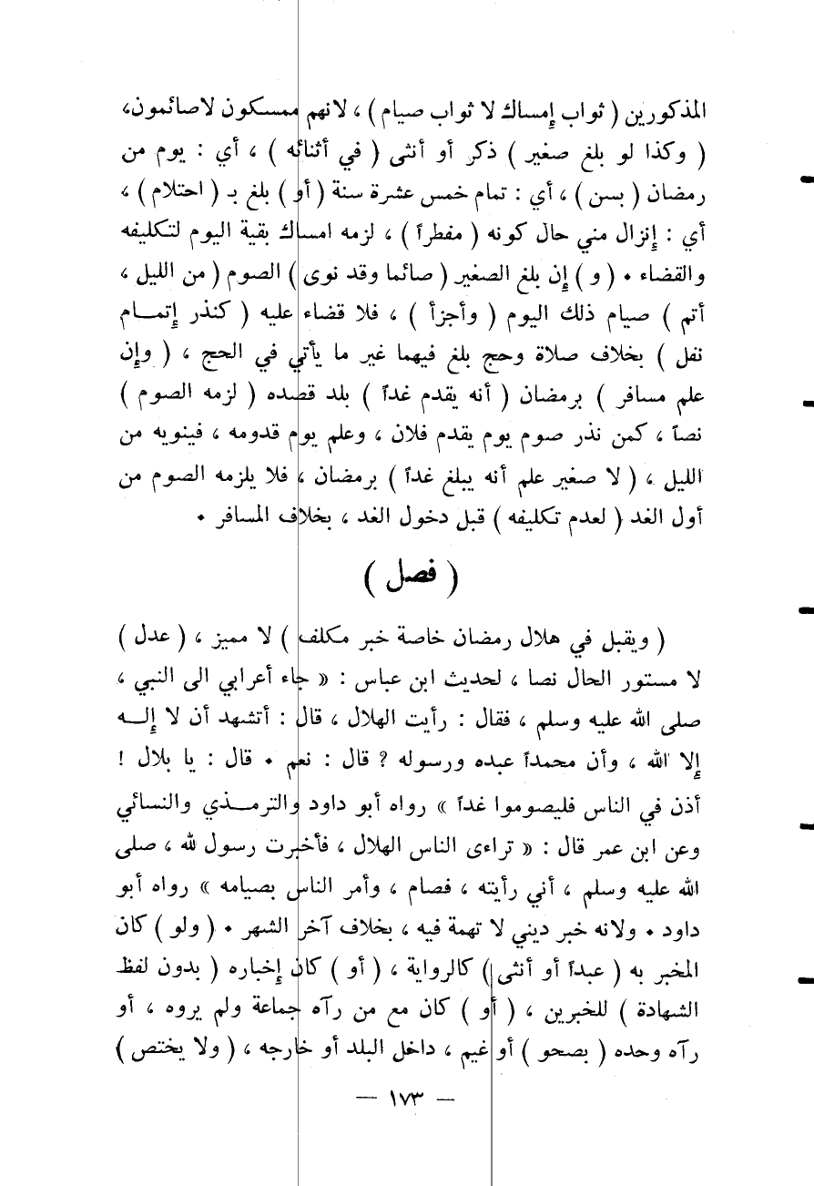 (فَصْلٌ) (وَيُقْبَلُ فِي هِلَالِ رَمَضَانَ خَاصَّةً خَبَرُ مُكَلَّفٍ) لَا مُمَيِّزٍ، (عَدْلٍ) لَا مَسْتُورِ الْحَالِ نَصًّا، لِحَدِيثِ ابْنِ عَبَّاسٍ: «جَاءَ أَعْرَابِيُّ إلَى النَّبِيِّ - صَلَّى اللَّهُ عَلَيْهِ وَسَلَّمَ - فَقَالَ: رَأَيْتُ الْهِلَالَ، قَالَ: أَتَشْهَدُ أَنْ لَا إلَهَ إلَّا اللَّهُ، وَأَنَّ مُحَمَّدًا عَبْدُهُ وَرَسُولُهُ قَالَ: نَعَمْ. قَالَ: يَا بِلَالُ، أَذِّنْ فِي النَّاسِ فَلْيَصُومُوا غَدًا» رَوَاهُ أَبُو دَاوُد وَالتِّرْمِذِيُّ وَالنَّسَائِيُّ «وَعَنْ ابْنِ عُمَرَ قَالَ: تَرَاءَى النَّاسُ الْهِلَالَ، فَأَخْبَرْتُ رَسُولَ اللَّهِ - صَلَّى اللَّهُ عَلَيْهِ وَسَلَّمَ - أَنِّي رَأَيْتُهُ، فَصَامَ، وَأَمَرَ النَّاسَ بِصِيَامِهِ» رَوَاهُ أَبُو دَاوُد. وَلِأَنَّهُ خَبَرٌ دِينِيٌّ لَا تُهْمَةَ فِيهِ، بِخِلَافِ آخِرِ الشَّهْرِ. (وَلَوْ) كَانَ الْمُخْبِرُ بِهِ (عَبْدًا أَوْ أُنْثَى) كَالرِّوَايَةِ، (أَوْ) كَانَ إخْبَارُهُ (بِدُونِ لَفْظِ الشَّهَادَةِ) لِلْخَبَرَيْنِ، (أَوْ) كَانَ مَعَ مَنْ رَآهُ جَمَاعَةٌ وَلَمْ يَرَوْهُ، أَوْ رَآهُ وَحْدَهُ (بِصَحْوٍ) أَوْ غَيْمٍ، دَاخِلَ الْبَلَدِ أَوْ خَارِجَهُ، (وَلَا يَخْتَصُّ)