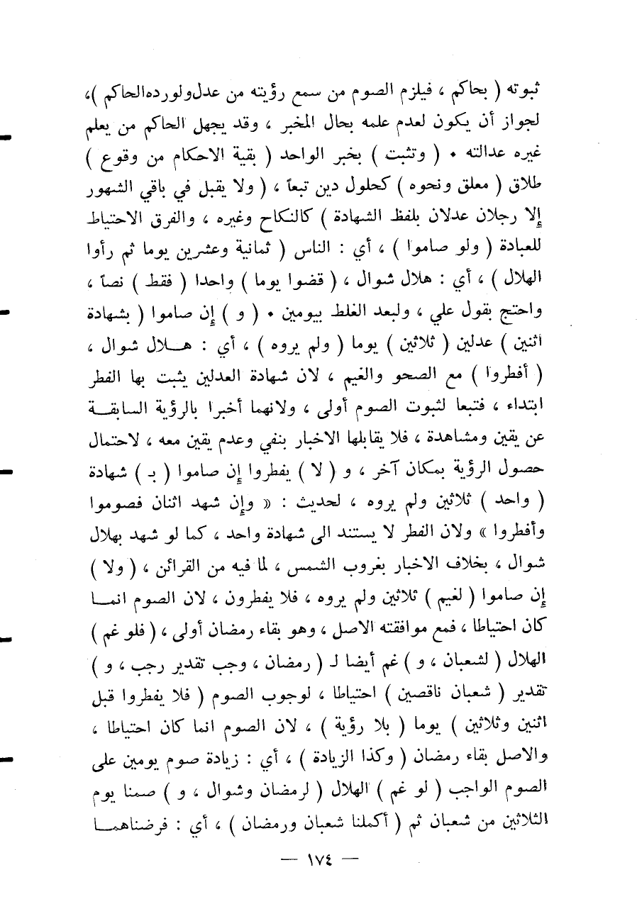 (وَتَثْبُتُ) بِخَبَرِ الْوَاحِدِ (بَقِيَّةُ الْأَحْكَامِ مِنْ وُقُوعِ) طَلَاقٍ (مُعَلَّقٍ وَنَحْوِهِ) كَحُلُولِ دَيْنٍ تَبَعًا، (وَلَا يُقْبَلُ فِي بَاقِي الشُّهُورِ إلَّا رَجُلَانِ عَدْلَانِ بِلَفْظِ الشَّهَادَةِ) كَالنِّكَاحِ وَغَيْرِهِ، وَالْفَرْقُ الِاحْتِيَاطُ لِلْعِبَادَةِ (وَلَوْ صَامُوا) ، أَيْ: النَّاسُ (ثَمَانِيَةً وَعِشْرِينَ يَوْمًا ثُمَّ رَأَوْا الْهِلَالَ) ، أَيْ: هِلَالَ شَوَّالٍ، (قَضَوْا يَوْمًا) وَاحِدًا (فَقَطْ) نَصًّا، وَاحْتَجَّ بِقَوْلِ عَلِيٍّ، وَلِبُعْدِ الْغَلَطِ بِيَوْمَيْنِ. (وَ) إنْ صَامُوا (بِشَهَادَةِ اثْنَيْنِ) عَدْلَيْنِ (ثَلَاثِينَ) يَوْمًا (وَلَمْ يَرَوْهُ) ، أَيْ: هِلَالَ شَوَّالٍ، (أَفْطَرُوا) مَعَ الصَّحْوِ وَالْغَيْمِ، لِأَنَّ شَهَادَةَ الْعَدْلَيْنِ يَثْبُتُ بِهَا الْفِطْرُ ابْتِدَاءً، فَتَبَعًا لِثُبُوتِ الصَّوْمِ أَوْلَى، وَلِأَنَّهُمَا أَخْبَرَا بِالرُّؤْيَةِ السَّابِقَةِ عَنْ يَقِينٍ وَمُشَاهَدَةٍ، فَلَا يُقَابِلُهَا الْإِخْبَارُ بِنَفْيٍ وَعَدَمِ يَقِينٍ مَعَهُ، لِاحْتِمَالِ حُصُولِ الرُّؤْيَةِ بِمَكَانٍ آخَرَ، وَ (لَا) يُفْطِرُوا إنْ صَامُوا (بِ) شَهَادَةِ (وَاحِدٍ) ثَلَاثِينَ وَلَمْ يَرَوْهُ، لِحَدِيثِ: «وَإِنْ شَهِدَ اثْنَانِ فَصُومُوا وَأَفْطِرُوا» وَلِأَنَّ الْفِطْرَ لَا يَسْتَنِدُ إلَى شَهَادَةِ وَاحِدٍ، كَمَا لَوْ شَهِدَ بِهِلَالِ شَوَّالٍ، بِخِلَافِ الْإِخْبَارِ بِغُرُوبِ الشَّمْسِ، لِمَا فِيهِ مِنْ الْقَرَائِنِ، (وَلَا) إنْ صَامُوا (لِغَيْمٍ) ثَلَاثِينَ وَلَمْ يَرَوْهُ، فَلَا يُفْطِرُونَ، لِأَنَّ الصَّوْمَ إنَّمَا كَانَ احْتِيَاطًا، فَمَعَ مُوَافَقَتِهِ الْأَصْلَ، وَهُوَ بَقَاءُ رَمَضَانَ أَوْلَى.