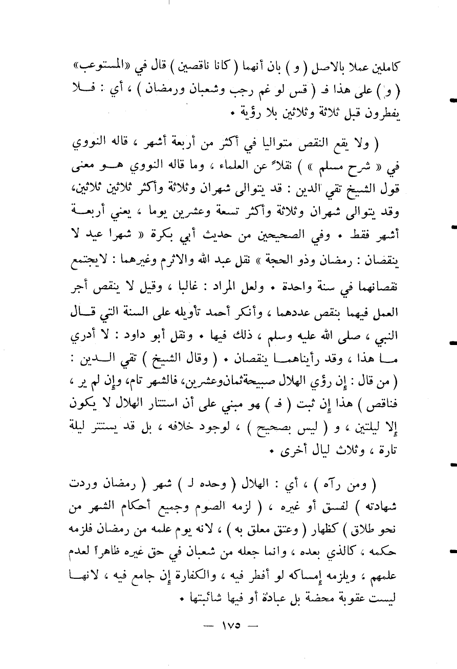 كَامِلَيْنِ عَمَلًا بِالْأَصْلِ (وَ) بَانَ أَنَّهُمَا (كَانَا نَاقِصَيْنِ) قَالَ فِي " الْمُسْتَوْعِبِ " (وَ) عَلَى هَذَا فَ (قِسْ لَوْ غُمَّ رَجَبٌ وَشَعْبَانُ وَرَمَضَانُ) ، أَيْ: فَلَا يُفْطِرُونَ قَبْلَ ثَلَاثَةٍ وَثَلَاثِينَ بِلَا رُؤْيَةٍ. (وَلَا يَقَعُ النَّقْصُ مُتَوَالِيًا فِي أَكْثَرَ مِنْ أَرْبَعَةِ أَشْهُرٍ، قَالَهُ النَّوَوِيُّ فِي شَرْحِ مُسْلِمٍ ") نَقْلًا عَنْ الْعُلَمَاءِ وَمَا قَالَهُ النَّوَوِيُّ هُوَ مَعْنَى قَوْلِ الشَّيْخِ تَقِيِّ الدِّينِ: قَدْ يَتَوَالَى شَهْرَانِ وَثَلَاثَةٌ وَأَكْثَرُ ثَلَاثِينَ ثَلَاثِينَ، وَقَدْ يَتَوَالَى شَهْرَانِ وَثَلَاثَةٌ وَأَكْثَرُ تِسْعَةً وَعِشْرِينَ يَوْمًا، يَعْنِي أَرْبَعَةَ أَشْهُرٍ فَقَطْ. وَفِي الصَّحِيحَيْنِ مِنْ حَدِيثِ أَبِي بَكْرَةَ «شَهْرَا عِيدٍ لَا يَنْقُصَانِ: رَمَضَانُ وَذُو الْحِجَّةِ» نَقَلَ عَبْدُ اللَّهِ وَالْأَثْرَمُ وَغَيْرُهُمَا: لَا يَجْتَمِعُ نُقْصَانُهُمَا فِي سَنَةٍ وَاحِدَةٍ. وَلَعَلَّ الْمُرَادَ: غَالِبًا، وَقِيلَ لَا يَنْقُصُ أَجْرُ الْعَمَلِ فِيهِمَا بِنَقْصِ عَدَدِهِمَا، وَأَنْكَرَ أَحْمَدُ تَأْوِيلَهُ عَلَى السَّنَةِ الَّتِي قَالَ النَّبِيُّ - صَلَّى اللَّهُ عَلَيْهِ وَسَلَّمَ - ذَلِكَ فِيهَا. وَنَقَلَ أَبُو دَاوُد: لَا أَدْرِي مَا هَذَا، وَقَدْ رَأَيْنَاهُمَا يَنْقُصَانِ. (وَقَالَ الشَّيْخُ) تَقِيُّ الدِّينِ: (مَنْ قَالَ: إنْ رُئِيَ الْهِلَالُ صَبِيحَةَ ثَمَانٍ وَعِشْرِينَ، فَالشَّهْرُ تَامٌّ، وَإِنْ لَمْ يُرَ، فَنَاقِصٌ) هَذَا إنْ ثَبَتَ (فَ) هُوَ مَبْنِيٌّ عَلَى أَنَّ اسْتِتَارَ الْهِلَالِ لَا يَكُونُ إلَّا لَيْلَتَيْنِ، وَ (لَيْسَ بِصَحِيحٍ) ، لِوُجُودِ خِلَافِهِ، بَلْ قَدْ يَسْتَتِرُ لَيْلَةً تَارَةً، وَثَلَاثَ لَيَالٍ أُخْرَى.