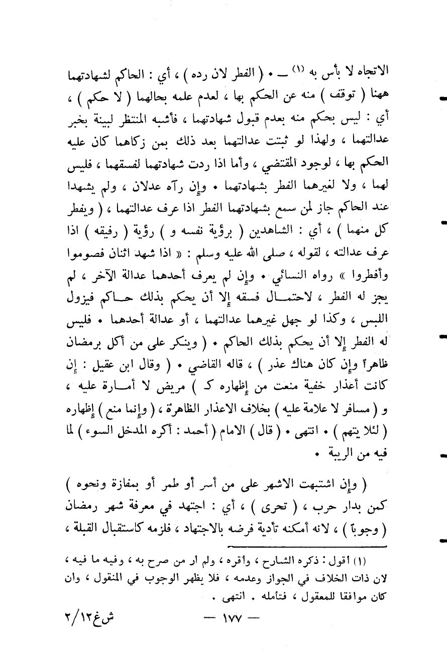 الِاتِّجَاهُ لَا بَأْسَ بِهِ، - (الْفِطْرُ لِأَنَّ رَدَّهُ) ، أَيْ: الْحَاكِمِ لِشَهَادَتِهِمَا هَهُنَا (تَوَقُّفٌ) مِنْهُ عَنْ الْحُكْمِ بِهَا، لِعَدَمِ عِلْمِهِ بِحَالِهِمَا (لَا حُكْمٌ) ، أَيْ: لَيْسَ بِحُكْمٍ مِنْهُ بِعَدَمِ قَبُولِ شَهَادَتِهِمَا، فَأَشْبَهَ الْمُنْتَظِرَ لِبَيِّنَةٍ بِخَبَرِ عَدَالَتِهِمَا، وَلِهَذَا لَوْ ثَبَتَتْ عَدَالَتُهُمَا بَعْدَ ذَلِكَ بِمَنْ زَكَّاهُمَا كَانَ عَلَيْهِ الْحُكْمُ بِهَا، لِوُجُودِ الْمُقْتَضِي، وَأَمَّا إذَا رُدَّتْ شَهَادَتُهُمَا لِفِسْقِهِمَا، فَلَيْسَ لَهُمَا، وَلَا لِغَيْرِهِمَا الْفِطْرُ بِشَهَادَتِهِمَا. وَإِنْ رَآهُ عَدْلَانِ، وَلَمْ يَشْهَدَا عِنْدَ الْحَاكِمِ جَازَ لِمَنْ سَمِعَ بِشَهَادَتِهِمَا الْفِطْرُ إذَا عَرَفَ عَدَالَتَهُمَا، (وَيُفْطِرُ كُلٌّ مِنْهُمَا) ، أَيْ: الشَّاهِدَيْنِ (بِرُؤْيَةِ نَفْسِهِ وَ) رُؤْيَةِ (رَفِيقِهِ) إذَا عَرَفَ عَدَالَتَهُ، لِقَوْلِهِ - صَلَّى اللَّهُ عَلَيْهِ وَسَلَّمَ -: «إذَا شَهِدَ اثْنَانِ فَصُومُوا وَأَفْطِرُوا» رَوَاهُ النَّسَائِيّ. وَإِنْ لَمْ يَعْرِفْ أَحَدُهُمَا عَدَالَةَ الْآخَرِ، لَمْ يَجُزْ لَهُ الْفِطْرُ، لِاحْتِمَالِ فِسْقِهِ إلَّا أَنْ يَحْكُمَ بِذَلِكَ حَاكِمٌ فَيَزُولُ اللَّبْسُ، وَكَذَا لَوْ جَهِلَ غَيْرُهُمَا عَدَالَتَهُمَا، أَوْ عَدَالَةَ أَحَدِهِمَا. فَلَيْسَ لَهُ الْفِطْرُ إلَّا أَنْ يَحْكُمَ بِذَلِكَ الْحَاكِمُ.