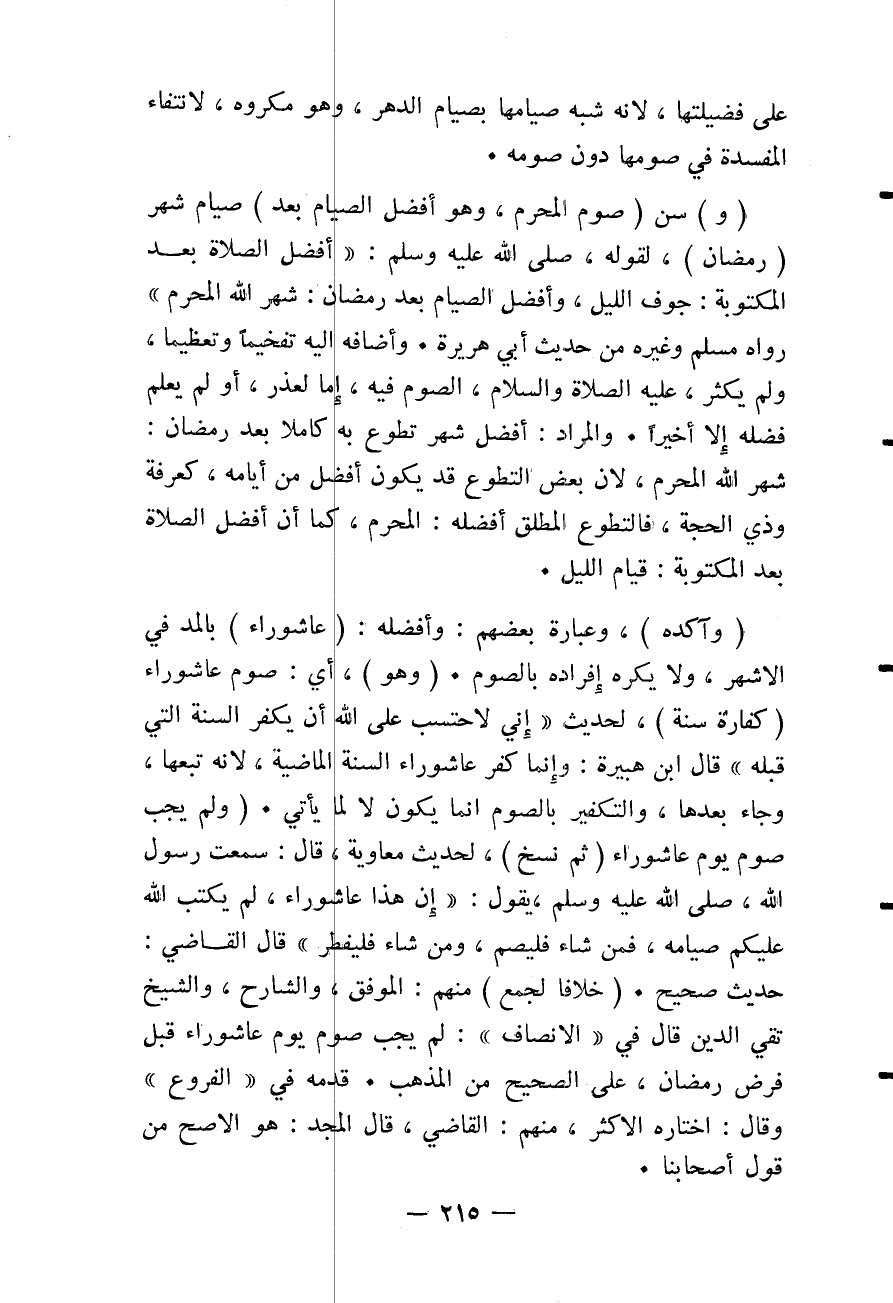 (وَ) سُنَّ (صَوْمُ الْمُحَرَّمِ، وَهُوَ أَفْضَلُ الصِّيَامِ بَعْدَ) صِيَامِ شَهْرِ (رَمَضَانَ) ؛ لِقَوْلِهِ - صَلَّى اللَّهُ عَلَيْهِ وَسَلَّمَ -: «أَفْضَلُ الصَّلَاةِ بَعْدَ الْمَكْتُوبَةِ: جَوْفُ اللَّيْلِ، وَأَفْضَلُ الصِّيَامِ بَعْدَ رَمَضَانَ: شَهْرُ اللَّهِ الْمُحَرَّمُ» رَوَاهُ مُسْلِمٌ وَغَيْرُهُ مِنْ حَدِيثِ أَبِي هُرَيْرَةَ.