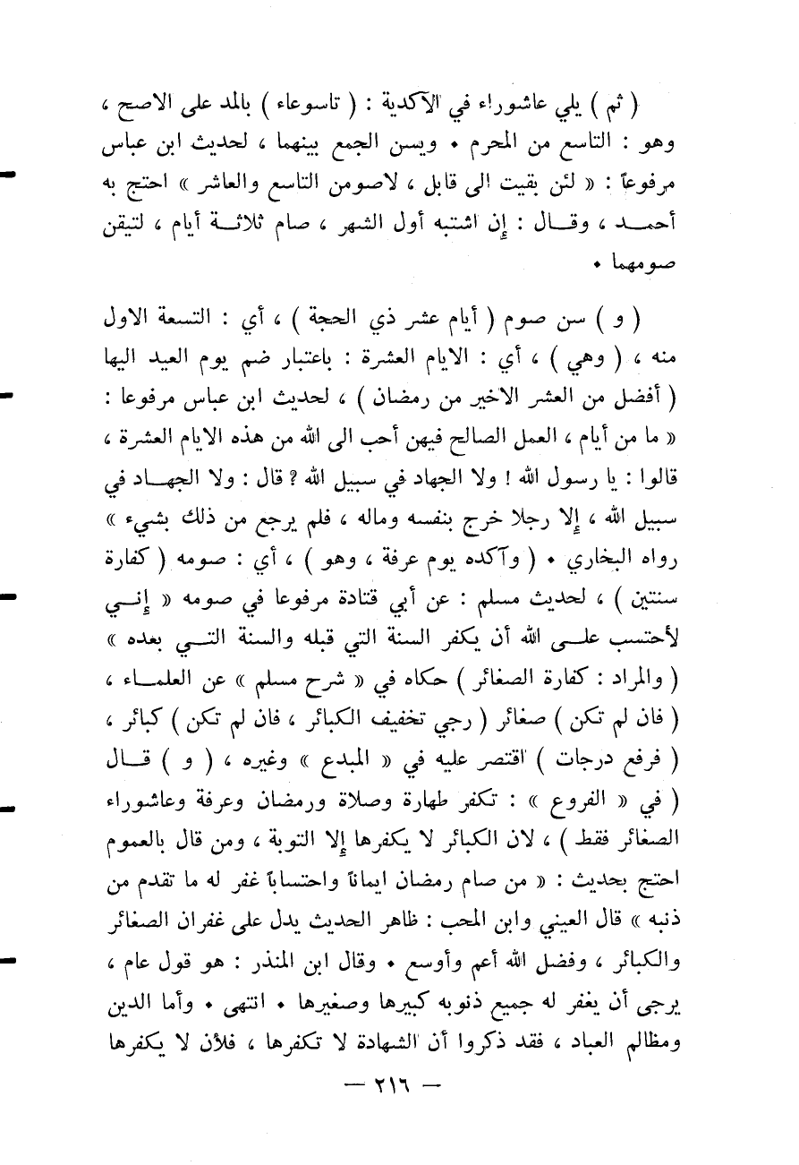 (وَآكَدُهُ يَوْمُ عَرَفَةَ، وَهُوَ) أَيْ: صَوْمُهُ (كَفَّارَةُ سَنَتَيْنِ) ؛ لِحَدِيثِ مُسْلِمٍ: عَنْ أَبِي قَتَادَةَ مَرْفُوعًا فِي صَوْمِهِ «إنِّي لَأَحْتَسِبُ عَلَى اللَّهِ أَنْ يُكَفِّرَ السَّنَةَ الَّتِي قَبْلَهُ وَالسَّنَةَ الَّتِي بَعْدَهُ» (وَالْمُرَادُ: كَفَّارَةُ الصَّغَائِرِ) حَكَاهُ فِي " شَرْحِ مُسْلِمٍ " عَنْ الْعُلَمَاءِ، (فَإِنْ لَمْ تَكُنْ) صَغَائِرُ (رُجِيَ تَخْفِيفُ الْكَبَائِرِ، فَإِنْ لَمْ تَكُنْ) كَبَائِرُ، (فَرَفْعُ دَرَجَاتٍ) اقْتَصَرَ عَلَيْهِ فِي " الْمُبْدِعِ " وَغَيْرِهِ، (وَ) قَالَ (فِي " الْفُرُوعِ ": تُكَفِّرُ طَهَارَةٌ وَصَلَاةٌ وَرَمَضَانُ وَعَرَفَةُ وَعَاشُورَاءُ الصَّغَائِرَ فَقَطْ) ؛ لِأَنَّ الْكَبَائِرَ لَا يُكَفِّرُهَا إلَّا التَّوْبَةُ، وَمَنْ قَالَ بِالْعُمُومِ احْتَجَّ بِحَدِيثِ: «مَنْ صَامَ رَمَضَانَ إيمَانًا وَاحْتِسَابًا غُفِرَ لَهُ مَا تَقَدَّمَ مِنْ ذَنْبِهِ» قَالَ الْعَيْنِيُّ وَابْنُ الْمُحِبِّ: ظَاهِرُ الْحَدِيثِ يَدُلُّ عَلَى غُفْرَانِ الصَّغَائِرِ وَالْكَبَائِرِ، وَفَضْلُ اللَّهِ أَعَمُّ وَأَوْسَعُ.