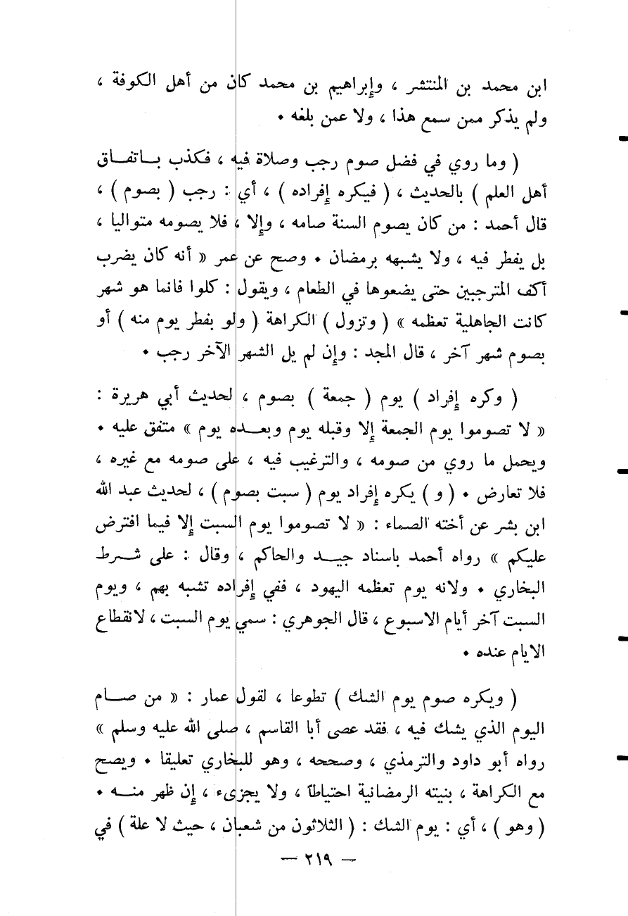 (وَ) يُكْرَهُ إفْرَادُ يَوْمِ (سَبْتٍ بِصَوْمٍ) ؛ لِحَدِيثِ عَبْدِ اللَّهِ بْنِ بِشْرٍ عَنْ أُخْتِهِ الصَّمَّاءِ: «لَا تَصُومُوا يَوْمَ السَّبْتِ إلَّا فِيمَا اُفْتُرِضَ عَلَيْكُمْ» رَوَاهُ أَحْمَدُ بِإِسْنَادٍ جَيِّدٍ وَالْحَاكِمُ، وَقَالَ: عَلَى شَرْطِ الْبُخَارِيِّ.