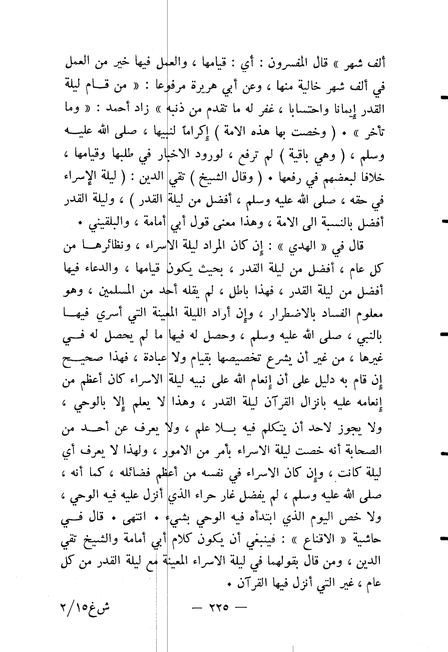 قَالَ فِي حَاشِيَةِ " الْإِقْنَاعِ ": فَيَنْبَغِي أَنْ يَكُونَ كَلَامُ أَبِي أُمَامَةَ وَالشَّيْخِ تَقِيِّ الدِّينِ، وَمَنْ قَالَ بِقَوْلِهِمَا فِي لَيْلَةِ الْإِسْرَاءِ الْمُعَيَّنَةِ مَعَ لَيْلَةِ الْقَدْرِ مِنْ كُلِّ عَامٍ، غَيْرَ الَّتِي أُنْزِلَ فِيهَا الْقُرْآنُ.