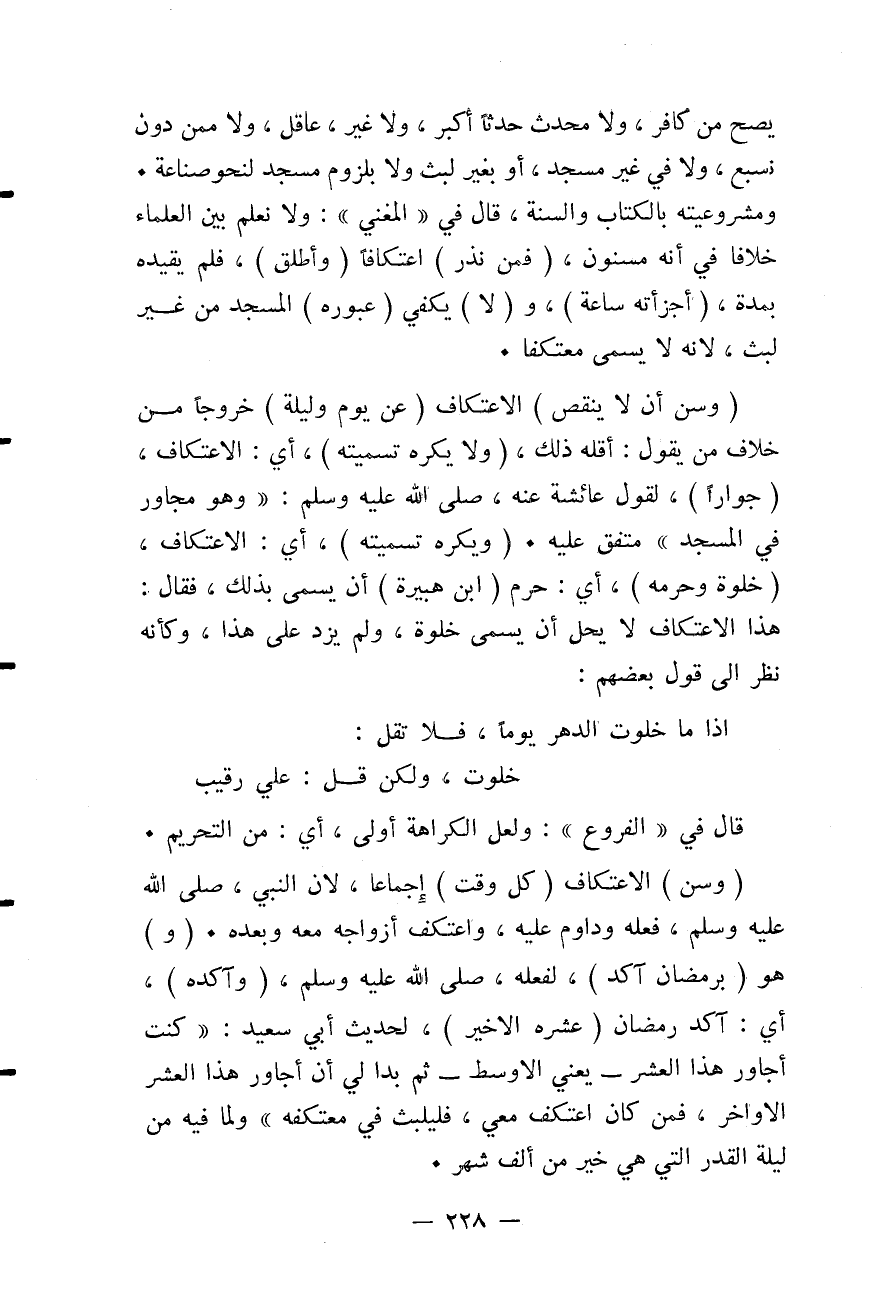 وَمَشْرُوعِيَّتُهُ بِالْكِتَابِ وَالسُّنَّةِ، قَالَ فِي " الْمُغْنِي ": وَلَا نَعْلَمُ بَيْنَ الْعُلَمَاءِ خِلَافًا فِي أَنَّهُ مَسْنُونٌ، (فَمَنْ نَذَرَ) اعْتِكَافًا (وَأَطْلَقَ) ، فَلَمْ يُقَيِّدْهُ بِمُدَّةٍ، (أَجْزَأَتْهُ سَاعَةٌ) ، و (لَا) يَكْفِي (عُبُورُهُ) الْمَسْجِدَ مِنْ غَيْرِ لَبْثٍ، لِأَنَّهُ لَا يُسَمَّى مُعْتَكِفًا.