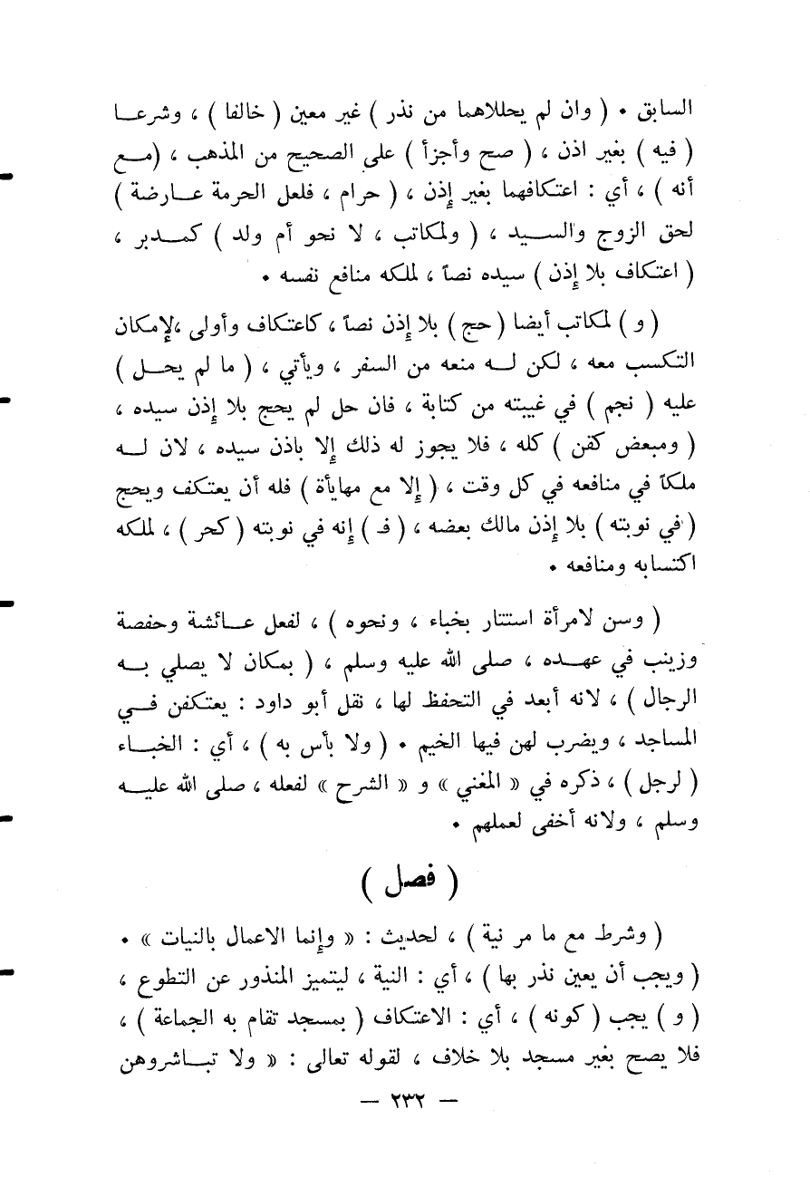 (وَإِنْ لَمْ يُحَلِّلَاهُمَا مِنْ نَذْرٍ) غَيْرِ مُعَيَّنٍ (خَالَفَا) ، وَشَرَعَا (فِيهِ) بِغَيْرِ إذْنٍ، (صَحَّ وَأَجْزَأَ) عَلَى الصَّحِيحِ مِنْ الْمَذْهَبِ، (مَعَ أَنَّهُ) ، أَيْ: اعْتِكَافَهُمَا بِغَيْرِ إذْنٍ، (حَرَامٌ، فَلَعَلَّ الْحُرْمَةَ عَارِضَةٌ) لِحَقِّ الزَّوْجِ وَالسَّيِّدِ، (وَلِمُكَاتَبٍ، لَا نَحْوُ أُمِّ وَلَدٍ) كَمُدَبَّرٍ، (اعْتِكَافٌ بِلَا إذْنِ) سَيِّدِهِ نَصًّا، لِمِلْكِهِ مَنَافِعَ نَفْسِهِ.
