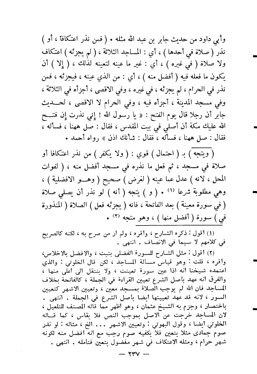 (فَمَنْ نَذَرَ اعْتِكَافًا، أَوْ) نَذَرَ (صَلَاةً فِي أَحَدِهَا) ، أَيْ: الْمَسَاجِدِ الثَّلَاثَةِ، (لَمْ يُجْزِئْهُ) اعْتِكَافٌ وَلَا صَلَاةٌ (فِي غَيْرِهِ) ، أَيْ: غَيْرُ مَا عَيَّنَهُ لِتَعَيُّنِهِ لِذَلِكَ، (إلَّا) أَنْ يَكُونَ مَا فَعَلَهُ فِيهِ (أَفْضَلَ مِنْهُ) ، أَيْ: مِنْ الَّذِي عَيَّنَهُ، فَيُجْزِئُهُ، فَمَنْ نَذَرَ فِي الْحَرَمِ، لَمْ يُجْزِئْهُ، فِي غَيْرِهِ، وَفِي الْأَقْصَى، أَجْزَأَهُ فِي الثَّلَاثَةِ، وَفِي مَسْجِدِ الْمَدِينَةِ، أَجُزْأَهُ فِيهِ، وَفِي الْحَرَمِ لَا الْأَقْصَى، لِحَدِيثِ جَابِرٍ «أَنَّ رَجُلًا قَالَ يَوْمَ الْفَتْحِ: يَا رَسُولَ اللَّهِ، إنِّي نَذَرْت إنْ فَتَحَ اللَّهُ عَلَيْك مَكَّةَ أَنْ أُصَلِّيَ فِي بَيْتِ الْمَقْدِسِ، فَقَالَ: صَلِّ هَا هُنَا، فَسَأَلَهُ، فَقَالَ: صَلِّ هَا هُنَا، فَسَأَلَهُ، فَقَالَ: شَأْنُك إذَنْ» رَوَاهُ أَحْمَدُ.