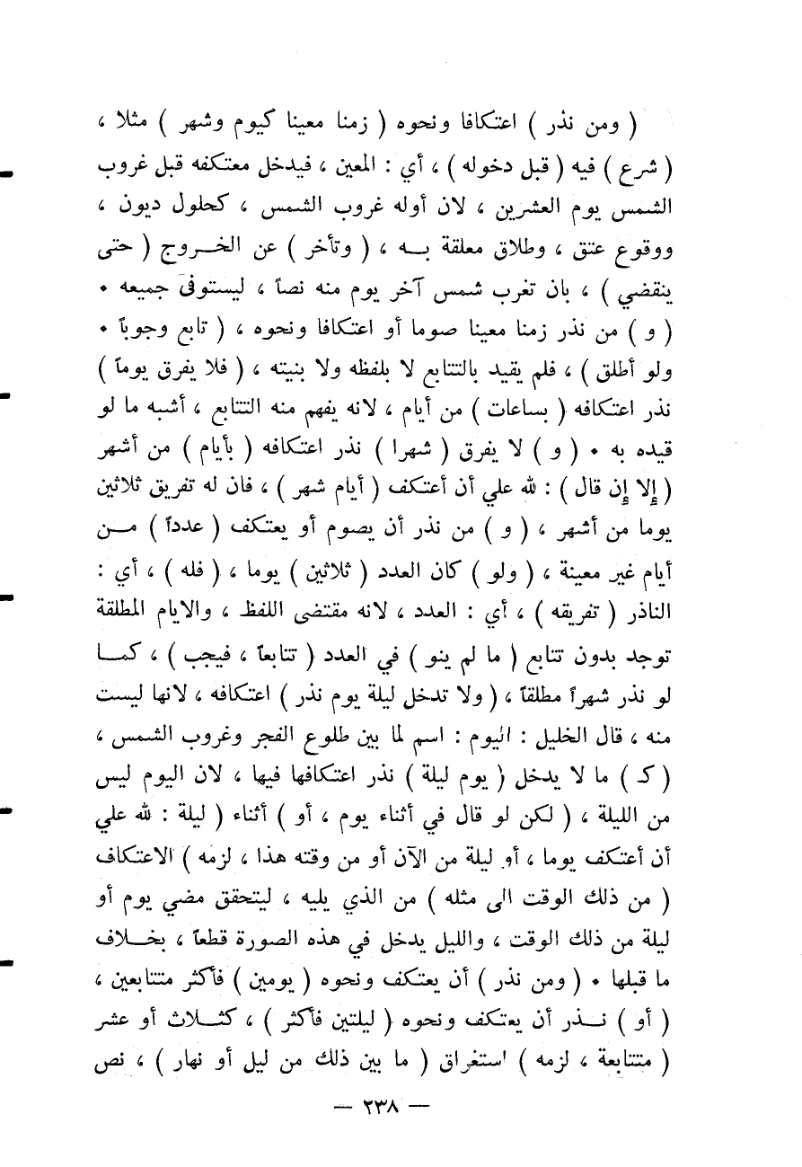 (وَمَنْ نَذَرَ) اعْتِكَافًا وَنَحْوَهُ (زَمَنًا مُعَيَّنًا كَيَوْمٍ وَشَهْرٍ) مَثَلًا، (شَرَعَ) فِيهِ (قَبْلَ دُخُولِهِ) ، أَيْ: الْمُعَيَّنِ، فَيَدْخُلُ مُعْتَكَفَهُ قَبْلَ غُرُوبِ الشَّمْسِ يَوْمَ الْعِشْرِينَ، لِأَنَّ أَوَّلَهُ غُرُوبُ الشَّمْسِ، كَحُلُولِ دُيُونٍ، وَوُقُوعِ عِتْقٍ، وَطَلَاقِ مُعَلَّقَةٍ بِهِ، (وَتَأَخَّرَ) عَنْ الْخُرُوجِ (حَتَّى يَنْقَضِيَ) ، بِأَنْ تَغْرُبَ شَمْسُ آخِرِ يَوْمٍ مِنْهُ نَصًّا، لِيَسْتَوْفِيَ جَمِيعَهُ.