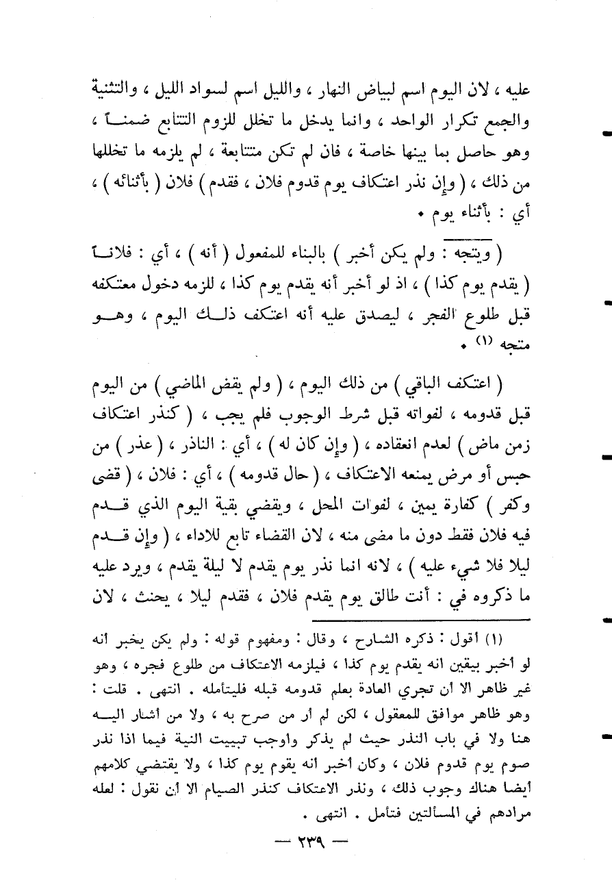 عَلَيْهِ، لِأَنَّ الْيَوْمَ اسْمٌ لِبَيَاضِ النَّهَارِ، وَاللَّيْلُ اسْمٌ لِسَوَادِ اللَّيْلِ، وَالتَّثْنِيَةُ وَالْجَمْعُ تَكْرَارُ الْوَاحِدِ، وَإِنَّمَا يَدْخُلُ مَا تَخَلَّلَ لِلُزُومِ التَّتَابُعِ ضِمْنًا، وَهُوَ حَاصِلٌ بِمَا بَيْنَهَا خَاصَّةً، فَإِنْ لَمْ تَكُنْ مُتَتَابِعَةً، لَمْ يَلْزَمْهُ مَا تَخَلَّلَهَا مِنْ ذَلِكَ، (وَإِنْ نَذَرَ اعْتِكَافَ يَوْمِ قُدُومِ فُلَانٍ، فَقَدِمَ) فُلَانٌ (بِأَثْنَائِهِ) ، أَيْ: بِأَثْنَاءِ يَوْمٍ.