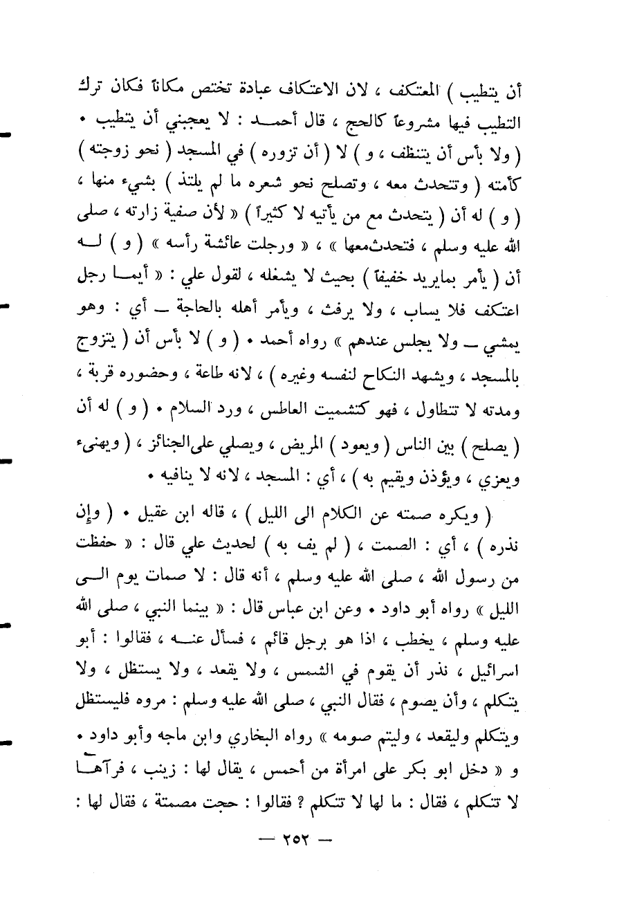 (وَلَا بَأْسَ أَنْ يَتَنَظَّفَ، وَ) لَا (أَنْ تَزُورَهُ) فِي الْمَسْجِدِ (نَحْوُ زَوْجَتِهِ) كَأَمَتِهِ (وَتَتَحَدَّثُ مَعَهُ، وَتُصْلِحُ نَحْوَ شَعْرِهِ مَا لَمْ يَلْتَذَّ) بِشَيْءٍ مِنْهَا، (وَ) لَهُ أَنْ (يَتَحَدَّثَ مَعَ مَنْ يَأْتِيه لَا كَثِيرًا) «لِأَنَّ صَفِيَّةَ زَارَتْهُ - صَلَّى اللَّهُ عَلَيْهِ وَسَلَّمَ - فَتَحَدَّثَ مَعَهَا» ، «وَرَجَّلَتْ عَائِشَةُ رَأْسَهُ» ، (وَ) لَهُ أَنْ (يَأْمُرَ بِمَا يُرِيدُ خَفِيفًا) بِحَيْثُ لَا يَشْغَلُهُ، لِقَوْلِ عَلِيٍّ: " أَيُّمَا رَجُلٍ اعْتَكَفَ فَلَا يُسَابُّ، وَلَا يَرْفُثُ، وَيَأْمُرُ أَهْلَهُ بِالْحَاجَةِ - أَيْ: وَهُوَ يَمْشِي - وَلَا يَجْلِسْ عِنْدَهُمْ " رَوَاهُ أَحْمَدُ.