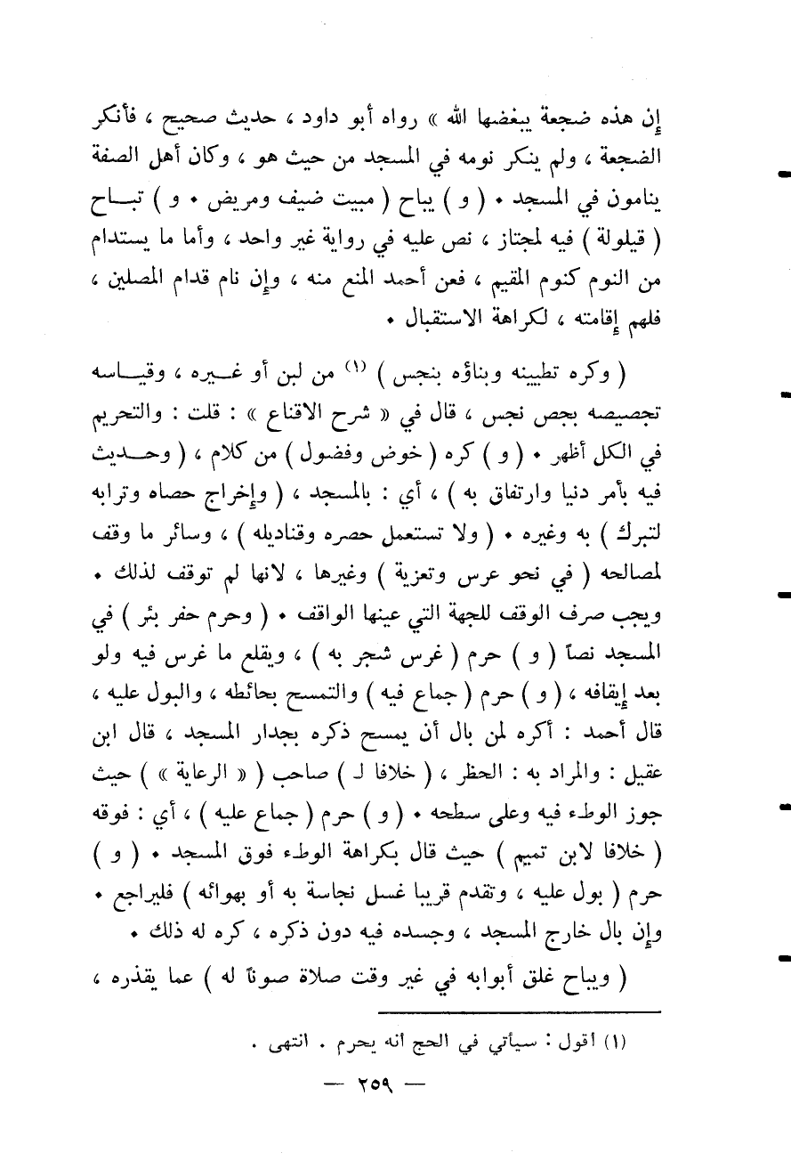 (وَحَرُمَ حَفْرُ بِئْرٍ) فِي الْمَسْجِدِ نَصًّا (وَ) حَرُمَ (غَرْسُ شَجَرٍ بِهِ) ، وَيُقْلَعُ مَا غُرِسَ فِيهِ وَلَوْ بَعْدَ إيقَافِهِ، (و) حَرُمَ (جِمَاعٌ فِيهِ) وَالتَّمَسُّحُ بِحَائِطِهِ، وَالْبَوْلُ عَلَيْهِ، قَالَ أَحْمَدُ: أَكْرَهُ لِمَنْ بَالَ أَنْ يَمْسَحَ ذَكَرَهُ بِجِدَارِ الْمَسْجِدِ قَالَ ابْنُ عَقِيلٍ: وَالْمُرَادُ بِهِ: الْحَظْرُ، (خِلَافًا ل) صَاحِبِ (الرِّعَايَةِ ") حَيْثُ جَوَّزَ الْوَطْءَ فِيهِ وَعَلَى سَطْحِهِ.