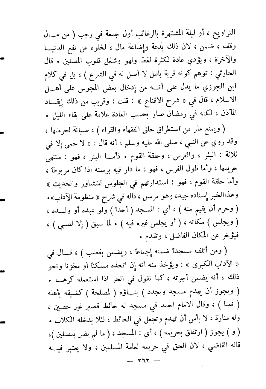 التَّرَاوِيحِ، أَوْ لَيْلَةِ الْمُشْتَهِرَةِ بِالرَّغَائِبِ أَوَّلَ جُمُعَةٍ فِي رَجَبٍ (مِنْ مَالِ وَقْفٍ، ضَمِنَ، لِأَنَّ ذَلِكَ بِدْعَةٌ وَإِضَاعَةُ مَالٍ، لِخُلُوِّهِ عَنْ نَفْعِ الدُّنْيَا وَالْآخِرَةِ، وَيُؤَدِّي عَادَةً لِكَثْرَةِ لَغَطٍ وَلَهْوٍ وَشُغْلِ قُلُوبِ الْمُصَلِّينَ. قَالَ الْحَارِثِيُّ: تَوَهَّمَ كَوْنَهُ قُرْبَةً بَاطِلٌ لَا أَصْلَ لَهُ فِي الشَّرْعِ)