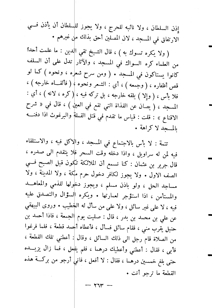 إذْنُ السُّلْطَانِ، وَلَا نَائِبِهِ لِلْحَرَجِ، وَلَا يَجُوزُ لِلسُّلْطَانِ أَنْ يَأْذَنَ فِي الِارْتِفَاقِ فِي الْمَسْجِدِ، لِأَنَّ الْمُصَلِّينَ أَحَقُّ بِذَلِكَ مِنْ غَيْرِهِمْ.