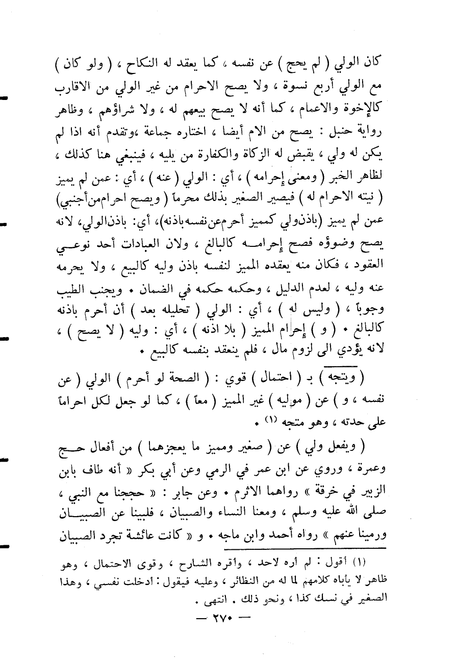 وَعَنْ جَابِرٍ: «حَجَجْنَا مَعَ النَّبِيِّ - صَلَّى اللَّهُ عَلَيْهِ وَسَلَّمَ - وَمَعَنَا النِّسَاءُ وَالصِّبْيَانُ، فَلَبَّيْنَا عَنْ الصِّبْيَانِ وَرَمَيْنَا عَنْهُمْ» رَوَاهُ أَحْمَدُ وَابْنُ مَاجَهْ. و " كَانَتْ عَائِشَةُ تُجَرِّدُ الصِّبْيَانَ