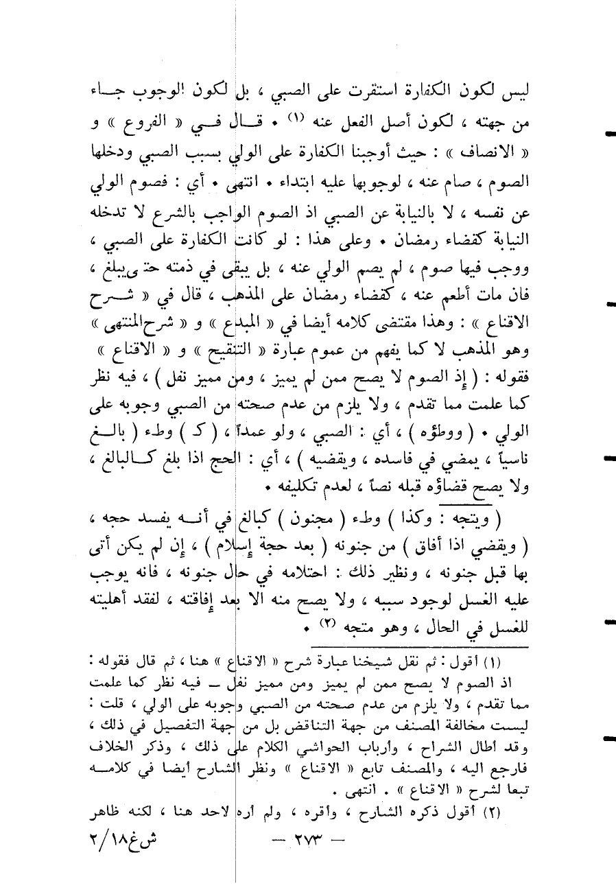 وَعَلَى هَذَا: لَوْ كَانَتْ الْكَفَّارَةُ عَلَى الصَّبِيِّ، وَوَجَبَ فِيهَا صَوْمٌ، لَمْ يَصُمْ الْوَلِيُّ عَنْهُ، بَلْ يَبْقَى فِي ذِمَّتِهِ حَتَّى يَبْلُغَ، فَإِنْ مَاتَ أُطْعِمَ عَنْهُ، كَقَضَاءِ رَمَضَانَ عَلَى الْمَذْهَبِ، قَالَ فِي " شَرْحِ الْإِقْنَاعِ ": وَهَذَا مُقْتَضَى كَلَامِهِ أَيْضًا فِي " الْمُبْدِعِ " وَشَرْحِ الْمُنْتَهَى " وَهُوَ الْمَذْهَبُ لَا كَمَا يُفْهَمُ مِنْ عُمُومِ عِبَارَةِ " التَّنْقِيحِ " و " الْإِقْنَاعِ " فَقَوْلُهُ: (إذْ الصَّوْمُ لَا يَصِحُّ مِمَّنْ لَمْ يُمَيِّزْ، وَمِنْ مُمَيِّزٍ نَفْلٌ) ، فِيهِ نَظَرٌ كَمَا عَلِمْت مِمَّا تَقَدَّمَ، وَلَا يَلْزَمُ مِنْ عَدَمِ صِحَّتِهِ مِنْ الصَّبِيِّ وُجُوبُهُ عَلَى الْوَلِيِّ.