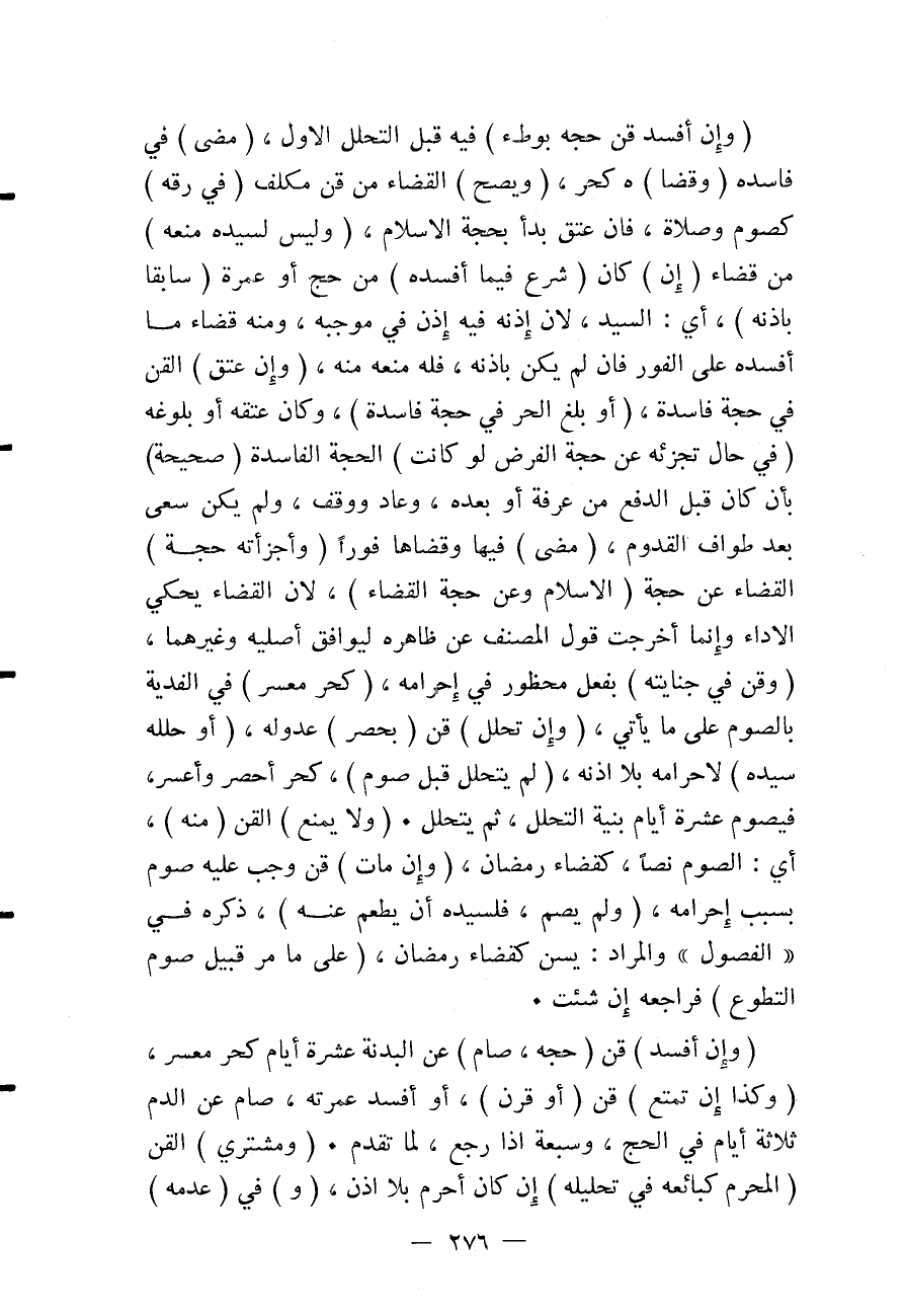 (وَإِنْ أَفْسَدَ قِنٌّ حَجَّهُ بِوَطْءٍ) فِيهِ قَبْلَ التَّحَلُّلِ الْأَوَّلِ، (مَضَى) فِي فَاسِدِهِ (وَقَضَاهُ) كَحُرٍّ، (وَيَصِحُّ) الْقَضَاءُ مِنْ قِنٍّ مُكَلَّفٍ (فِي رِقِّهِ) كَصَوْمٍ وَصَلَاةٍ، فَإِنْ عَتَقَ بَدَأَ بِحَجَّةِ الْإِسْلَامِ، (وَلَيْسَ لِسَيِّدِهِ مَنْعُهُ) مِنْ قَضَاءٍ (إنْ) كَانَ (شَرَعَ فِيمَا أَفْسَدَهُ) مِنْ حَجٍّ أَوَعُمْرَةً (سَابِقًا بِإِذْنِهِ) ، أَيْ: السَّيِّدِ، لِأَنَّ إذْنَهُ فِيهِ إذْنٌ فِي مُوجَبِهِ، وَمِنْهُ قَضَاءُ مَا أَفْسَدَهُ عَلَى الْفَوْرِ فَإِنْ لَمْ يَكُنْ بِإِذْنِهِ، فَلَهُ مَنْعُهُ مِنْهُ، (وَإِنْ عَتَقَ) الْقِنُّ فِي حَجَّةٍ فَاسِدَةٍ، (أَوْ بَلَغَ الْحُرُّ فِي حَجَّةٍ فَاسِدَةٍ) ، وَكَانَ عِتْقُهُ أَوْ بُلُوغُهُ (فِي حَالٍ تُجْزِئُهُ عَنْ حَجَّةِ الْفَرْضِ لَوْ كَانَتْ) الْحَجَّةُ الْفَاسِدَةُ (صَحِيحَةً) بِأَنْ كَانَ قَبْلَ الدَّفْعِ مِنْ عَرَفَةَ أَوْ بَعْدَهُ، وَعَادَ وَوَقَفَ، وَلَمْ يَكُنْ سَعَى بَعْدَ طَوَافِ الْقُدُومِ، (مَضَى) فِيهَا وَقَضَاهَا فَوْرًا (وَأَجْزَأَتْهُ حَجَّةُ) الْقَضَاءِ عَنْ حَجَّةِ (الْإِسْلَامِ وَعَنْ حَجَّةِ الْقَضَاءِ) ، لِأَنَّ الْقَضَاءَ يَحْكِي الْأَدَاءَ، وَإِنَّمَا أَخْرَجْتُ قَوْلَ الْمُصَنِّفِ عَنْ ظَاهِرِهِ لِيُوَافِقَ أَصْلَيْهِ وَغَيْرَهُمَا