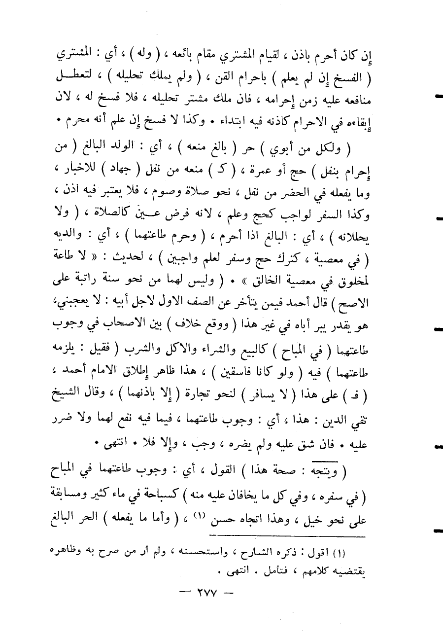 (وَلَيْسَ لَهُمَا مِنْ نَحْوِ سُنَّةٍ رَاتِبَةٍ عَلَى الْأَصَحِّ) قَالَ أَحْمَدُ فِيمَنْ يَتَأَخَّرُ عَنْ الصَّفِّ الْأَوَّلِ لِأَجْلِ أَبِيهِ: لَا يُعْجِبُنِي، هُوَ يَقْدِرُ أَنْ يَبَرَّ أَبَاهُ فِي غَيْرِ هَذَا (وَوَقَعَ خِلَافٌ) بَيْنَ الْأَصْحَابِ فِي وُجُوبِ طَاعَتِهِمَا (فِي الْمُبَاحِ) كَالْبَيْعِ وَالشِّرَاءِ وَالْأَكْلِ وَالشُّرْبِ (فَقِيلَ: يَلْزَمُهُ طَاعَتُهُمَا) فِيهِ (وَلَوْ كَانَا فَاسِقَيْنِ) ، هَذَا ظَاهِرُ إطْلَاقِ الْإِمَامِ أَحْمَدَ، (ف) عَلَى هَذَا (لَا يُسَافِرُ) لِنَحْوِ تِجَارَةٍ (إلَّا بِإِذْنِهِمَا) ، وَقَالَ الشَّيْخُ تَقِيُّ الدِّينِ: هَذَا، أَيْ: وُجُوبُ طَاعَتِهِمَا، فِيمَا فِيهِ نَفْعٌ لَهُمَا وَلَا ضَرَرَ عَلَيْهِ، فَإِنْ شَقَّ عَلَيْهِ وَلَمْ يَضُرَّهُ، وَجَبَ، وَإِلَّا فَلَا انْتَهَى.