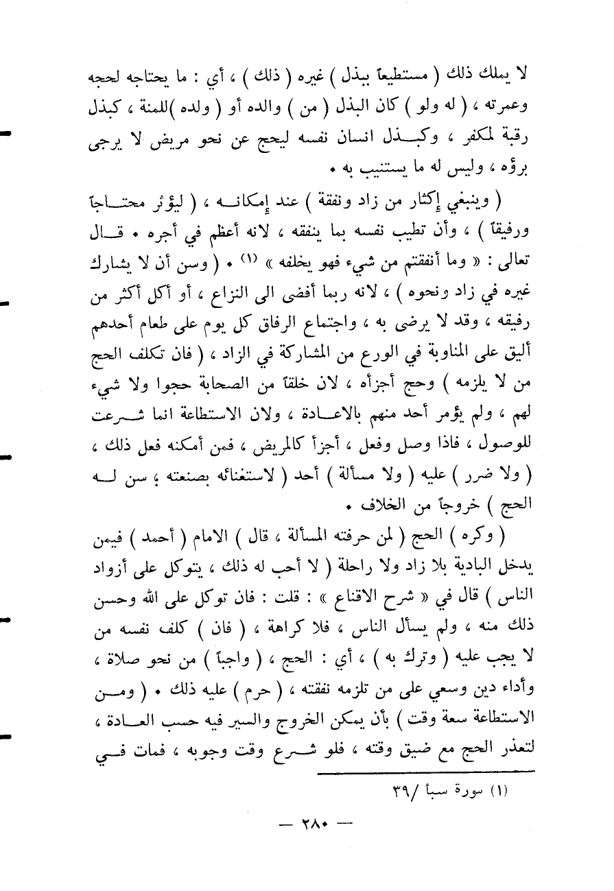 (وَسُنَّ أَنْ لَا يُشَارِكَ غَيْرَهُ فِي زَادٍ وَنَحْوِهِ) ، لِأَنَّهُ رُبَّمَا أَفْضَى إلَى النِّزَاعِ، أَوْ أَكَلَ أَكْثَرَ مِنْ رَفِيقِهِ، وَقَدْ لَا يَرْضَى بِهِ، وَاجْتِمَاعُ الرِّفَاقِ كُلَّ يَوْمٍ عَلَى طَعَامِ أَحَدِهِمْ أَلْيَقُ عَلَى الْمُنَاوَبَةِ فِي الْوَرِعِ مِنْ الْمُشَارَكَةِ فِي الزَّادِ، (فَإِنْ تَكَلَّفَ الْحَجَّ مَنْ لَا 64 يَلْزَمُهُ) وَحَجَّ أَجُزْأَهُ، لِأَنَّ خَلْقًا مِنْ الصَّحَابَةِ حَجُّوا وَلَا شَيْءَ لَهُمْ، وَلَمْ يُؤْمَرْ أَحَدٌ مِنْهُمْ بِالْإِعَادَةِ، وَلِأَنَّ الِاسْتِطَاعَةَ إنَّمَا شُرِعَتْ لِلْوُصُولِ، فَإِذَا وَصَلَ وَفَعَلَ، أَجْزَأَ كَالْمَرِيضِ، فَمَنْ أَمْكَنَهُ فِعْلُ ذَلِكَ، (وَلَا ضَرَرَ) عَلَيْهِ (وَلَا مَسْأَلَةَ) أَحَدٍ (لِاسْتِغْنَائِهِ بِصَنْعَتِهِ؛ سُنَّ لَهُ الْحَجُّ) خُرُوجًا مِنْ الْخِلَافِ.