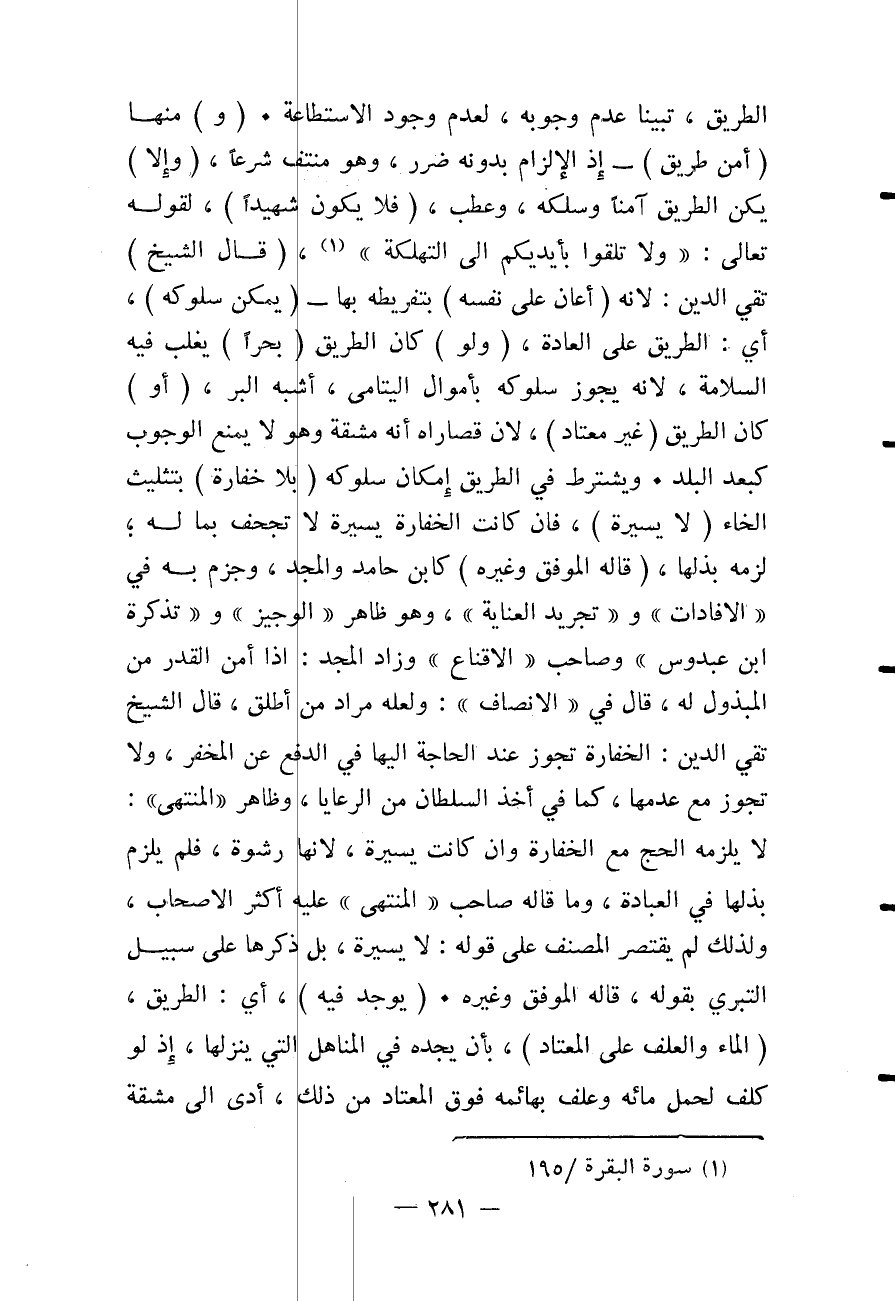 وَيُشْتَرَطُ فِي الطَّرِيقِ إمْكَانُ سُلُوكِهِ (بِلَا خِفَارَةٍ) بِتَثْلِيثِ الْخَاءِ (لَا يَسِيرَةٍ) ، فَإِنْ كَانَتْ الْخَفَارَةُ يَسِيرَةً لَا تُجْحِفُ بِمَالِهِ؛ لَزِمَهُ بَذْلُهَا، (قَالَهُ الْمُوَفَّقُ وَغَيْرُهُ) كَابْنِ حَامِدٍ وَالْمَجْدِ، وَجَزَمَ بِهِ فِي " الْإِفَادَاتِ " وَ " تَجْرِيدِ الْعِنَايَةِ "، وَهُوَ ظَاهِرُ " الْوَجِيزِ " وَ " تَذْكِرَةِ ابْنِ عَبْدُوسٍ " وَصَاحِبِ " الْإِقْنَاعِ " وَزَادَ الْمَجْدُ: إذَا أَمِنَ الْقَدْرَ مِنْ الْمَبْذُولِ لَهُ، قَالَ فِي " الْإِنْصَافِ ": وَلَعَلَّهُ مُرَادُ مَنْ أَطْلَقَ، قَالَ الشَّيْخُ تَقِيُّ الدِّينِ: الْخَفَارَةُ تَجُوزُ عِنْدَ الْحَاجَةِ إلَيْهَا فِي الدَّفْعِ عَنْ الْمُخَفَّرِ، وَلَا تَجُوزُ مَعَ عَدَمِهَا، كَمَا فِي أَخْذِ السُّلْطَانِ مِنْ الرَّعَايَا، وَظَاهِرُ " الْمُنْتَهَى ": لَا يَلْزَمُهُ الْحَجُّ مَعَ الْخَفَارَةِ وَإِنْ كَانَتْ يَسِيرَةً، لِأَنَّهَا رِشْوَةٌ، فَلَمْ يَلْزَمْ بَذْلُهَا فِي الْعِبَادَةِ، وَمَا قَالَهُ صَاحِبُ " الْمُنْتَهَى " عَلَيْهِ أَكْثَرُ الْأَصْحَابِ، وَلِذَلِكَ لَمْ يَقْتَصِرْ الْمُصَنَّفُ عَلَى قَوْلِهِ: لَا يَسِيرَةٍ، بَلْ ذَكَرَهَا عَلَى سَبِيلِ التَّبَرِّي بِقَوْلِهِ قَالَهُ الْمُوَفَّقُ وَغَيْرُهُ.