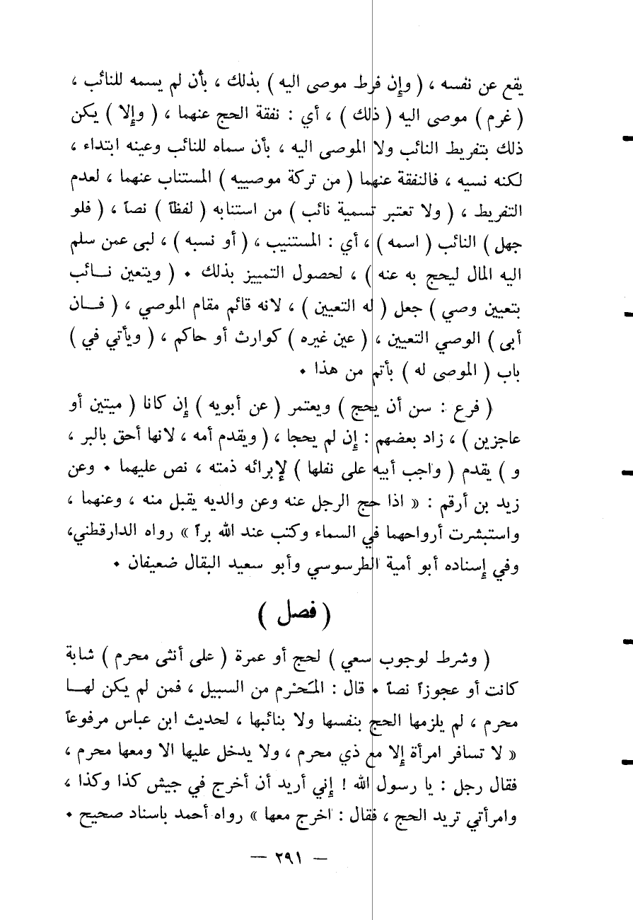 قَالَ: الْمَحْرَمُ مِنْ السَّبِيلِ، فَمَنْ لَمْ يَكُنْ لَهَا مَحْرَمٌ، لَمْ يَلْزَمْهَا الْحَجُّ بِنَفْسِهَا وَلَا بِنَائِبِهَا، لِحَدِيثِ ابْنِ عَبَّاسٍ مَرْفُوعًا «لَا تُسَافِرُ امْرَأَةٌ إلَّا مَعَ ذِي مَحْرَمٍ، وَلَا يُدْخَلُ عَلَيْهَا إلَّا وَمَعَهَا مَحْرَمٌ، فَقَالَ رَجُلٌ: يَا رَسُولَ اللَّهِ، إنِّي أُرِيدُ أَنْ أَخْرُجَ فِي جَيْشِ كَذَا وَكَذَا، وَامْرَأَتِي تُرِيدُ الْحَجَّ، فَقَالَ: اُخْرُجْ مَعَهَا» رَوَاهُ أَحْمَدُ بِإِسْنَادٍ صَحِيحٍ.