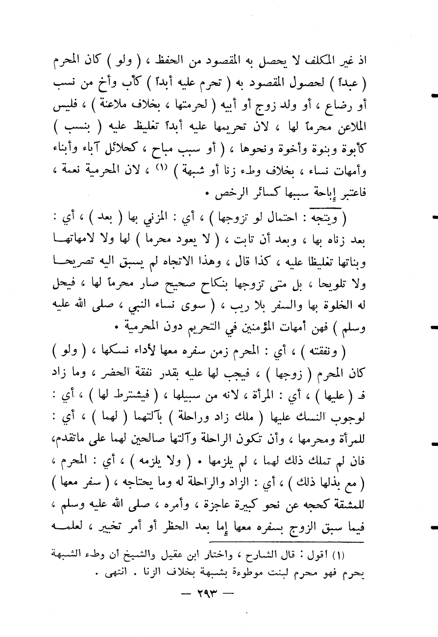 إذْ غَيْرُ الْمُكَلَّفِ: لَا يَحْصُلُ بِهِ الْمَقْصُودُ مِنْ الْحِفْظِ، (وَلَوْ) كَانَ الْمَحْرَمُ (عَبْدًا) لِحُصُولِ الْمَقْصُودِ بِهِ (تَحْرُمُ عَلَيْهِ أَبَدًا) كَأَبٍ وَأَخٍ مِنْ نَسَبٍ أَوْ رَضَاعٍ، أَوْ وَلَدِ زَوْجٍ أَوْ أَبِيهِ (لِحُرْمَتِهَا، بِخِلَافِ مُلَاعَنَةٍ) ، فَلَيْسَ الْمُلَاعِنُ مَحْرَمًا لَهَا، لِأَنَّ تَحْرِيمَهَا عَلَيْهِ أَبَدًا تَغْلِيظٌ عَلَيْهِ (بِنَسَبٍ) كَأُبُوَّةٍ وَبُنُوَّةٍ وَأُخُوَّةٍ وَنَحْوِهَا، (أَوْ سَبَبٍ مُبَاحٍ، كَحَلَائِلِ آبَاءٍ وَأَبْنَاءٍ وَأُمَّهَاتِ نِسَاءٍ، بِخِلَافِ وَطْءِ زِنًا أَوْ شُبْهَةٍ) ، لِأَنَّ الْمَحْرَمِيَّةَ نِعْمَةٌ، فَاعْتُبِرَ إبَاحَةُ سَبَبِهَا كَسَائِرٍ الرُّخَصِ.