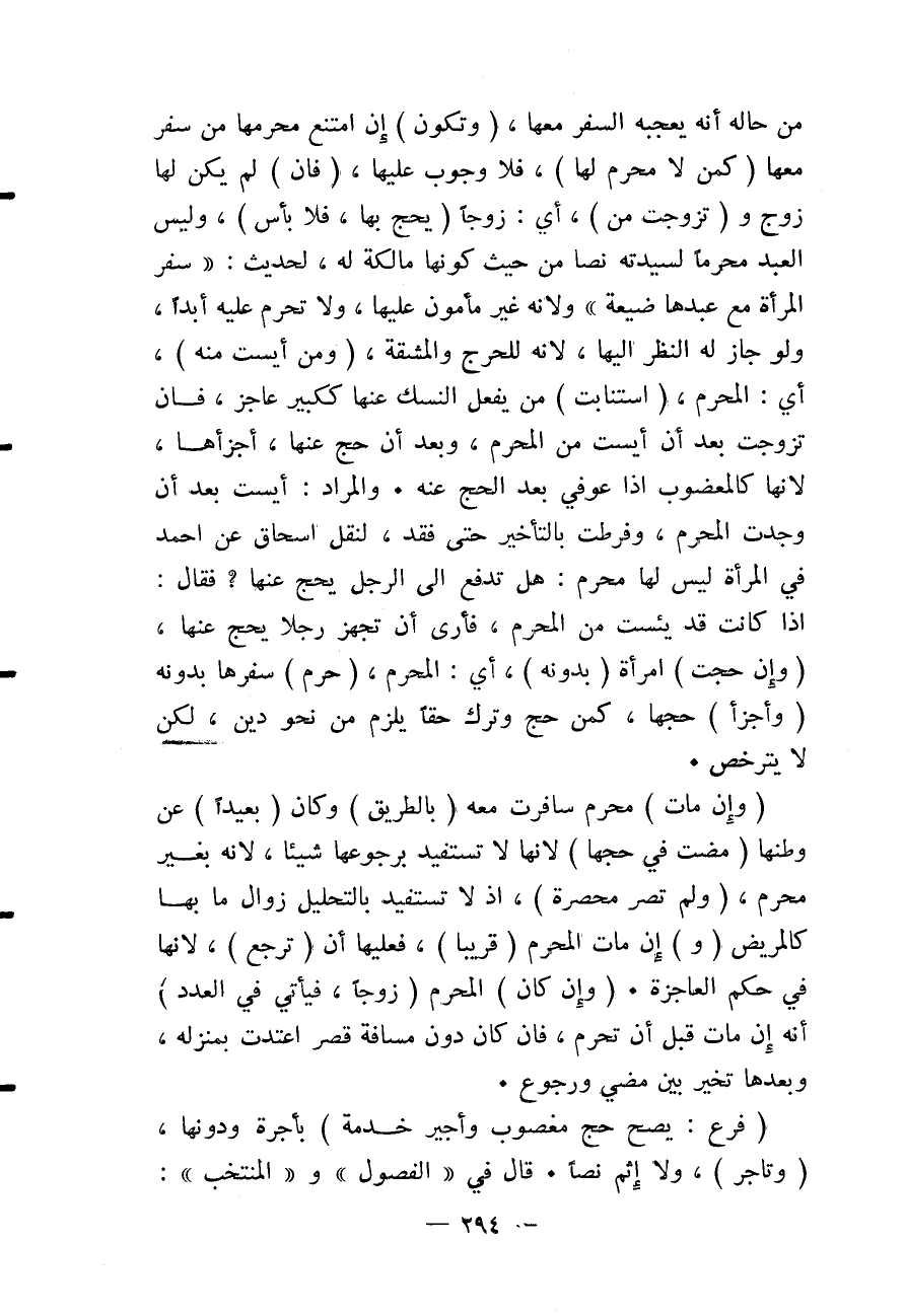 مِنْ حَالِهِ أَنَّهُ يُعْجِبُهُ السَّفَرُ مَعَهَا، (وَتَكُونُ) إنْ امْتَنَعَ مَحْرَمُهَا مِنْ سَفَرٍ مَعَهَا (كَمَنْ لَا مَحْرَمَ لَهَا) ، فَلَا وُجُوبَ عَلَيْهَا، (فَإِنْ) لَمْ يَكُنْ لَهَا زَوْجٌ و (تَزَوَّجَتْ مَنْ) ، أَيْ: زَوْجًا (يَحُجُّ بِهَا، فَلَا بَأْسَ) ، وَلَيْسَ الْعَبْدُ مَحْرَمًا لِسَيِّدَتِهِ نَصًّا مِنْ حَيْثُ كَوْنُهَا مَالِكَةً لَهُ، لِحَدِيثِ: «سَفَرُ الْمَرْأَةِ مَعَ عَبْدِهَا ضَيْعَةٌ» وَلِأَنَّهُ غَيْرُ مَأْمُونٍ عَلَيْهَا، وَلَا تَحْرُمُ عَلَيْهِ أَبَدًا، وَلَوْ جَازَ لَهُ النَّظَرُ إلَيْهَا، لِأَنَّهُ لِلْحَرَجِ وَالْمَشَقَّةِ.