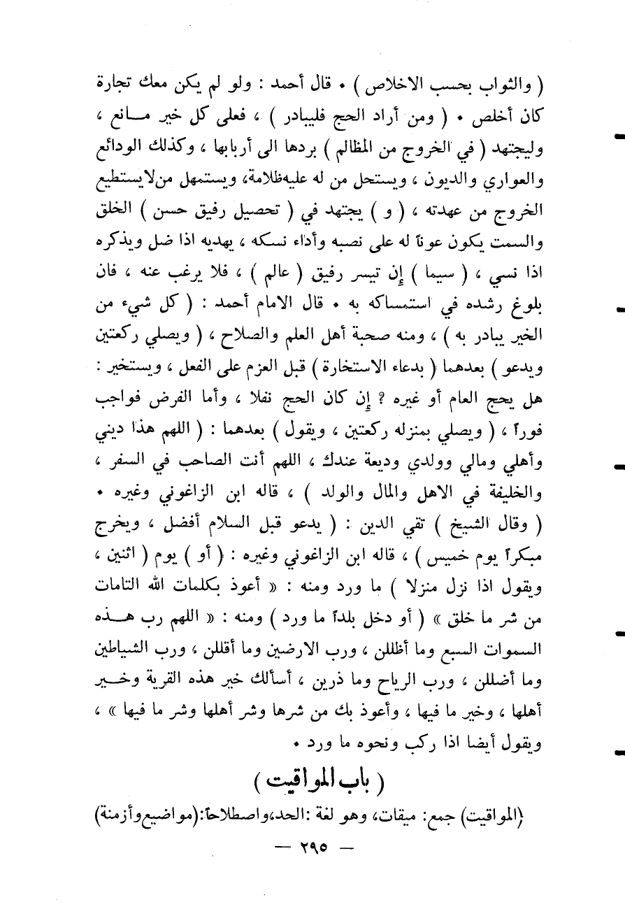 (وَقَالَ الشَّيْخُ) تَقِيُّ الدِّينِ: (يَدْعُو قَبْلَ السَّلَامِ أَفْضَلُ، وَيَخْرُجُ مُبَكِّرًا يَوْمَ خَمِيسٍ) ، قَالَهُ ابْنُ الزَّاغُونِيِّ وَغَيْرُهُ: (أَوْ) يَوْمَ (اثْنَيْنِ، وَيَقُولُ إذَا نَزَلَ مَنْزِلًا) مَا وَرَدَ وَمِنْهُ: «أَعُوذُ بِكَلِمَاتِ اللَّهِ التَّامَّاتِ مِنْ شَرِّ مَا خَلَقَ» (أَوْ دَخَلَ بَلَدًا مَا وَرَدَ) وَمِنْهُ: «اللَّهُمَّ رَبَّ هَذِهِ السَّمَوَاتِ السَّبْعِ وَمَا أَظْلَلْنَ، وَرَبَّ الْأَرَضِينَ وَمَا أَقْلَلْنَ، وَرَبَّ الشَّيَاطِينِ وَمَا أَضْلَلْنَ، وَرَبَّ الرِّيَاحِ وَمَا ذَرَيْنَ، أَسْأَلُك خَيْرَ هَذِهِ الْقَرْيَةِ وَخَيْرَ أَهْلِهَا، وَخَيْرَ مَا فِيهَا، وَأَعُوذُ بِك مِنْ شَرِّهَا وَشَرِّ أَهْلِهَا وَشَرِّ مَا فِيهَا» . وَيَقُولُ أَيْضًا إذَا رَكِبَ وَنَحْوُهُ مَا وَرَدَ