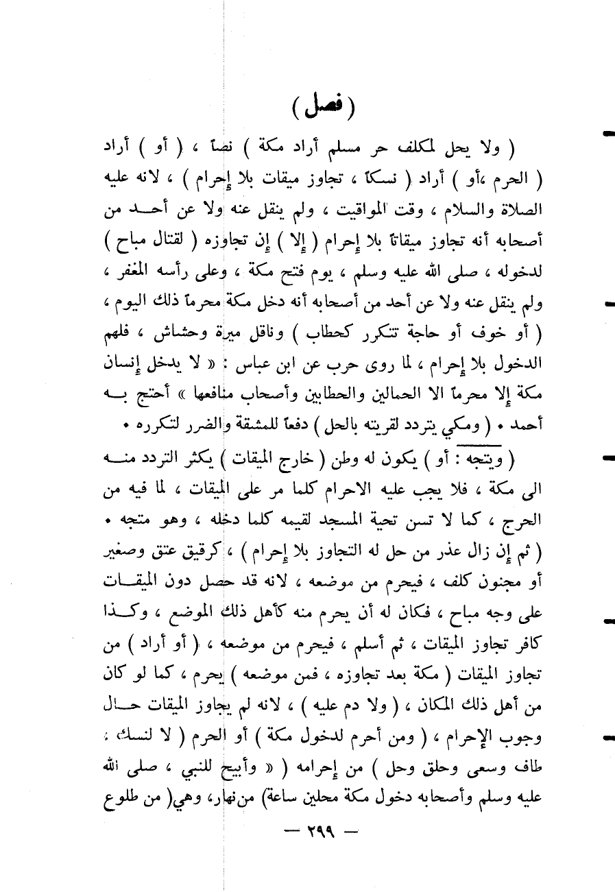 (فَصْلٌ) (وَلَا يَحِلُّ لِمُكَلَّفٍ حُرٍّ مُسْلِمٍ أَرَادَ مَكَّةَ) نَصًّا، (أَوْ) أَرَادَ (الْحَرَمَ، أَوْ) أَرَادَ (نُسُكًا، تَجَاوُزُ مِيقَاتٍ بِلَا إحْرَامٍ) ، لِأَنَّهُ - عَلَيْهِ الصَّلَاةُ وَالسَّلَامُ -، وَقَّتَ الْمَوَاقِيتَ، وَلَمْ يُنْقَلْ عَنْهُ وَلَا عَنْ أَحَدٍ مِنْ أَصْحَابِهِ أَنَّهُ تَجَاوَزَ مِيقَاتًا بِلَا إحْرَامٍ (إلَّا) إنْ تَجَاوَزَهُ (لِقِتَالٍ مُبَاحٍ) لِدُخُولِهِ - صَلَّى اللَّهُ عَلَيْهِ وَسَلَّمَ - يَوْمَ فَتْحِ مَكَّةَ، وَعَلَى رَأْسِهِ الْمِغْفَرُ، وَلَمْ يُنْقَلْ عَنْهُ وَلَا عَنْ أَحَدٍ مِنْ أَصْحَابِهِ أَنَّهُ دَخَلَ مَكَّةَ مُحْرِمًا ذَلِكَ الْيَوْمَ، (أَوْ خَوْفٍ أَوْ حَاجَةٍ تَتَكَرَّرُ كَحَطَّابٍ) وَنَاقِلِ مِيرَةٍ وَحَشَّاشٍ، فَلَهُمْ الدُّخُولُ بِلَا إحْرَامٍ، لِمَا رَوَى حَرْبٌ عَنْ ابْنِ عَبَّاسٍ: " لَا يَدْخُلُ إنْسَانٌ مَكَّةَ إلَّا مُحْرِمًا إلَّا الْحَمَّالِينَ وَالْحَطَّابِينَ وَأَصْحَابِ مَنَافِعِهَا " احْتَجَّ بِهِ أَحْمَدُ.