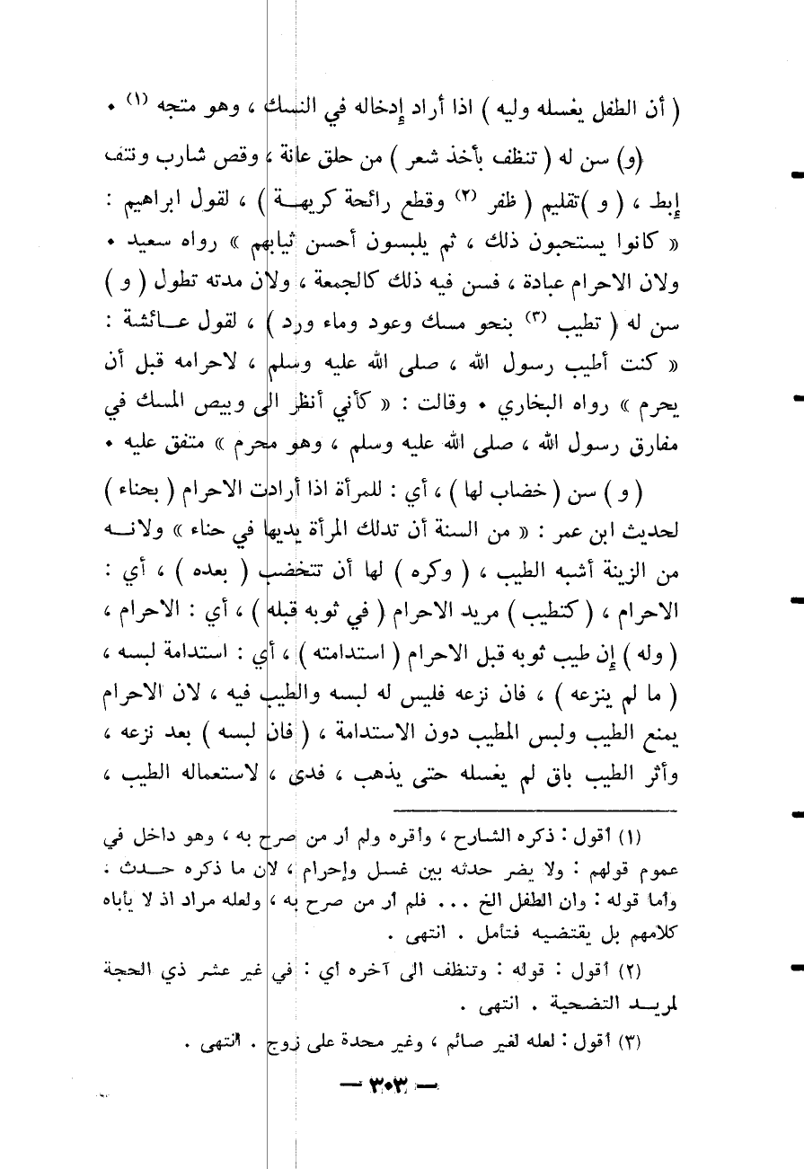 (وَ) سُنَّ (خِضَابٌ لَهَا) ، أَيْ: لِلْمَرْأَةِ إذَا أَرَادَتْ الْإِحْرَامَ (بِحِنَّاءٍ) لِحَدِيثِ ابْنِ عُمَرَ: " مِنْ السُّنَّةِ أَنْ تُدَلِّكَ الْمَرْأَةُ يَدَيْهَا فِي حِنَّاءٍ " وَلِأَنَّهُ مِنْ الزِّينَةِ أَشْبَهَ الطِّيبَ، (وَكُرِهَ) لَهَا أَنْ تَتَخَضَّبَ (بَعْدَهُ) ، أَيْ: الْإِحْرَامِ، (كَتَطَيُّبِ) مَرِيدِ الْإِحْرَامِ (فِي ثَوْبِهِ قَبْلَهُ) ، أَيْ: الْإِحْرَامِ، (وَلَهُ) إنْ طَيَّبَ ثَوْبَهُ قَبْلَ الْإِحْرَامِ (اسْتِدَامَتُهُ) ، أَيْ: اسْتِدَامَةُ لِبْسِهِ، (مَا لَمْ يَنْزِعْهُ) ، فَإِنْ نَزَعَهُ فَلَيْسَ لَهُ لِبْسُهُ وَالطِّيبُ فِيهِ، لِأَنَّ الْإِحْرَامَ يَمْنَعُ الطِّيبَ وَلِبْسُ الْمُطَيَّبِ دُونَ الِاسْتِدَامَةِ، (فَإِنْ لَبِسَهُ) بَعْدَ نَزْعِهِ، وَأَثَرُ الطِّيبِ بَاقٍ لَمْ يَغْسِلْهُ حَتَّى يَذْهَبَ، فَدَى، لِاسْتِعْمَالِهِ الطِّيبَ،