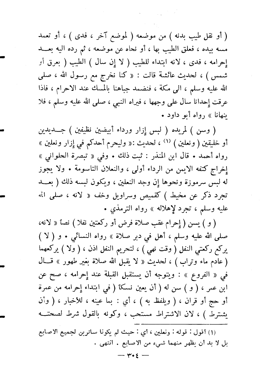 (وَسُنَّ) لِمَرِيدِهِ (لِبْسُ إزَارٍ وَرِدَاءٍ أَبْيَضَيْنِ نَظِيفِينَ) جَدِيدَيْنِ أَوْ خَلِيقَيْنِ (وَنَعْلَيْنِ) ، لِحَدِيثِ: «وَلْيُحْرِمْ أَحَدُكُمْ فِي إزَارٍ وَنَعْلَيْنِ» رَوَاهُ أَحْمَدُ. قَالَ ابْنُ الْمُنْذِرِ: ثَبَتَ ذَلِكَ. وَفِي " تَبْصِرَةِ الْحَلْوَانِيِّ " إخْرَاجُ كَتِفِهِ الْأَيْمَنِ مِنْ الرِّدَاءِ أَوْلَى، وَالنَّعْلَانِ التَّاسُومَةُ.