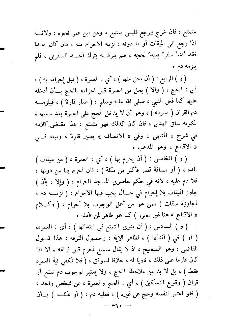 (وَ) الْخَامِسُ: (أَنْ يُحْرِمَ بِهَا) ، أَيْ: الْعُمْرَةِ، (مِنْ مِيقَاتِ) بَلَدِهِ، (أَوْ مَسَافَةِ قَصْرٍ فَأَكْثَرَ مِنْ مَكَّةَ) ، فَإِنْ أَحْرَمَ بِهَا مِنْ دُونِهَا، فَلَا دَمَ عَلَيْهِ، لِأَنَّهُ فِي حُكْمِ حَاضِرِي الْمَسْجِدِ الْحَرَامِ، (وَإِلَّا، بِأَنْ) جَاوَزَ الْمِيقَاتَ بِلَا إحْرَامٍ فِي حَالٍ يَجِبُ فِيهَا الْإِحْرَامُ، (لَزِمَهُ دَمٌ، لِمُجَاوَزَةِ مِيقَاتٍ) مِمَّنْ هُوَ مِنْ أَهْلِ الْوُجُوبِ بِلَا إحْرَامٍ، (وَكَلَامُ الْإِقْنَاعِ هُنَا غَيْرُ مُحَرَّرٍ) كَمَا هُوَ ظَاهِرٌ لِمَنْ تَأَمَّلَهُ.