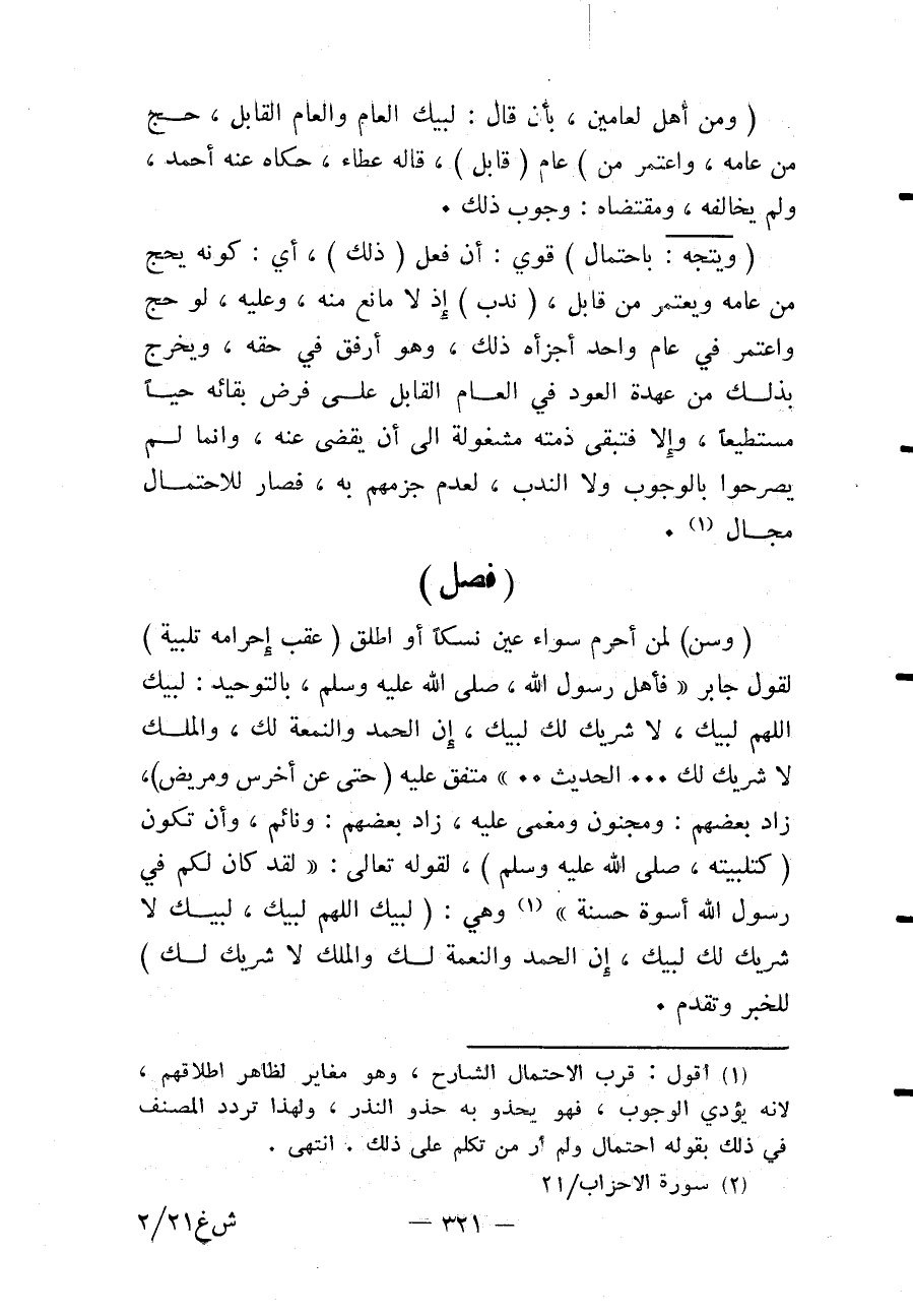 (فَصْلٌ) (وَسُنَّ) لِمَنْ أَحْرَمَ سَوَاءٌ عَيَّنَ نُسُكًا أَوْ أَطْلَقَ (عَقِبَ إحْرَامِهِ تَلْبِيَةٌ) لِقَوْلِ جَابِرٍ «فَأَهَلَّ رَسُولُ اللَّهِ - صَلَّى اللَّهُ عَلَيْهِ وَسَلَّمَ - بِالتَّوْحِيدِ: لَبَّيْكَ اللَّهُمَّ لَبَّيْكَ لَبَّيْكَ لَا شَرِيكَ لَك لَبَّيْكَ، إنَّ الْحَمْدَ وَالنِّعْمَةَ لَك، وَالْمُلْكَ لَا شَرِيكَ لَك» . الْحَدِيثَ. مُتَّفَقٌ عَلَيْهِ (حَتَّى عَنْ أَخْرَسَ وَمَرِيضٍ) ، زَادَ بَعْضُهُمْ: وَمَجْنُونٍ وَمُغْمًى عَلَيْهِ، زَادَ بَعْضُهُمْ: وَنَائِمٍ، وَأَنْ تَكُونَ (كَتَلْبِيَتِهِ - صَلَّى اللَّهُ عَلَيْهِ وَسَلَّمَ -) لِقَوْلِهِ تَعَالَى {لَقَدْ كَانَ لَكُمْ فِي رَسُولِ اللَّهِ أُسْوَةٌ حَسَنَةٌ} [الأحزاب: 21] وَهِيَ: «لَبَّيْكَ اللَّهُمَّ لَبَّيْكَ، لَبَّيْكَ لَا شَرِيكَ لَك لَبَّيْكَ، إنَّ الْحَمْدَ وَالنِّعْمَةَ لَك وَالْمُلْكَ لَا شَرِيكَ لَك» ) لِلْخَبَرِ وَتَقَدَّمَ