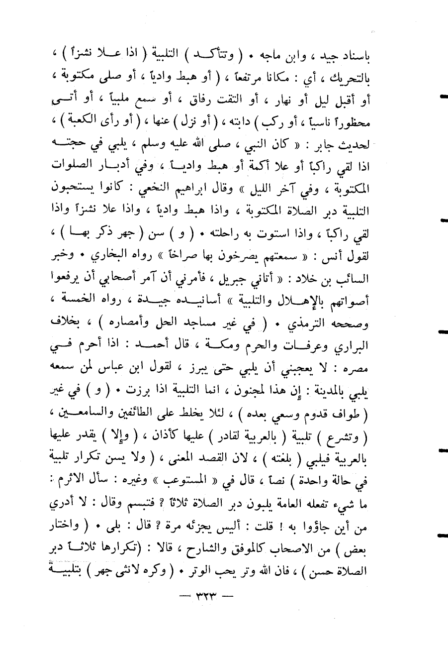 (وَتُشْرَعُ) تَلْبِيَةٌ (بِالْعَرَبِيَّةِ لِقَادِرٍ) عَلَيْهَا كَأَذَانٍ، (وَإِلَّا) يَقْدِرَ عَلَيْهَا بِالْعَرَبِيَّةِ فَيُلَبِّي (بِلُغَتِهِ) ، لِأَنَّ الْقَصْدَ الْمَعْنَى، (وَلَا يُسَنُّ تَكْرَارُ تَلْبِيَةٍ فِي حَالَةٍ وَاحِدَةٍ) نَصًّا، قَالَ فِي " الْمُسْتَوْعِبِ " وَغَيْرِهِ: سُئِلَ الْأَثْرَمُ: مَا شَيْءٌ تَفْعَلُهُ الْعَامَّةُ يُلَبُّونَ دُبُرَ الصَّلَاةِ ثَلَاثًا؟ فَتَبَسَّمَ وَقَالَ: لَا أَدْرِي مِنْ أَيْنَ جَاءُوا بِهِ، قُلْت: أَلَيْسَ يُجْزِئُهُ مَرَّةً؟ قَالَ: بَلَى.