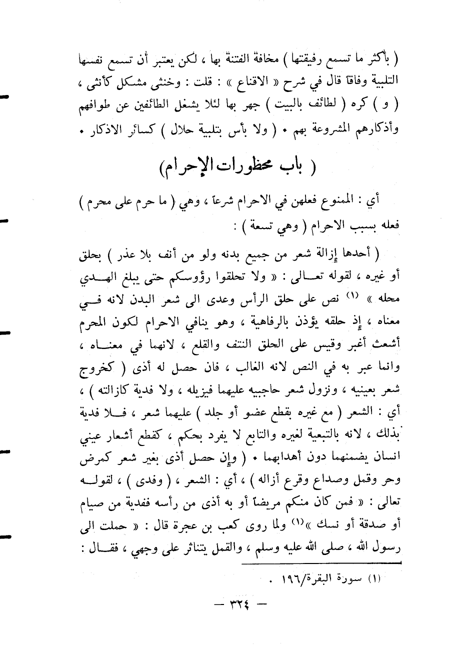 (بَابُ مَحْظُورَاتِ الْإِحْرَامِ) أَيْ: الْمَمْنُوعِ، فِعْلُهُنَّ فِي الْإِحْرَامِ شَرْعًا، وَهِيَ (مَا حُرِّمَ عَلَى مُحْرِمٍ) فِعْلُهُ بِسَبَبِ الْإِحْرَامِ (وَهِيَ تِسْعَةٌ) : (أَحَدُهَا إزَالَةُ شَعْرٍ مِنْ جَمِيعِ بَدَنِهِ، وَلَوْ مِنْ أَنْفٍ بِلَا عُذْرٍ) بِحَلْقٍ أَوْ غَيْرِهِ لِقَوْلِهِ تَعَالَى: {وَلا تَحْلِقُوا رُءُوسَكُمْ حَتَّى يَبْلُغَ الْهَدْيُ مَحِلَّهُ} [البقرة: 196] ، نَصَّ عَلَى حَلْقِ الرَّأْسِ وَعَدَّى إلَى شَعْرِ الْبَدَنِ لِأَنَّهُ فِي مَعْنَاهُ، إذْ حَلْقُهُ يُؤْذِنُ بِالرَّفَاهِيَةِ، وَهُوَ يُنَافِي الْإِحْرَامَ لِكَوْنِ الْمُحْرِمِ أَشْعَثَ أَغْبَرَ وَقِيسَ عَلَى الْحَلْقِ النَّتْفُ وَالْقَلْعُ، لِأَنَّهُمَا فِي مَعْنَاهُ، وَإِنَّمَا عُبِّرَ بِهِ فِي النَّصِّ لِأَنَّهُ الْغَالِبُ، فَإِنْ حَصَلَ لَهُ أَذًى (كَخُرُوجِ شَعْرٍ بِعَيْنَيْهِ، وَنُزُولِ شَعْرِ حَاجِبَيْهِ عَلَيْهِمَا فَيُزِيلُهُ، وَلَا فِدْيَةَ كَإِزَالَتِهِ) ، أَيْ: الشَّعْرِ (مَعَ غَيْرِهِ بِقَطْعِ عُضْوٍ أَوْ جِلْدٍ) عَلَيْهِمَا شَعْرٌ، فَلَا فِدْيَةَ بِذَلِكَ؛ لِأَنَّهُ بِالتَّبَعِيَّةِ لِغَيْرِهِ وَالتَّابِعُ لَا يُفْرَدُ بِحُكْمٍ، كَقَطْعِ أَشْعَارِ عَيْنَيْ إنْسَانٍ يَضْمَنُهُمَا دُونَ أَهْدَابِهِمَا.