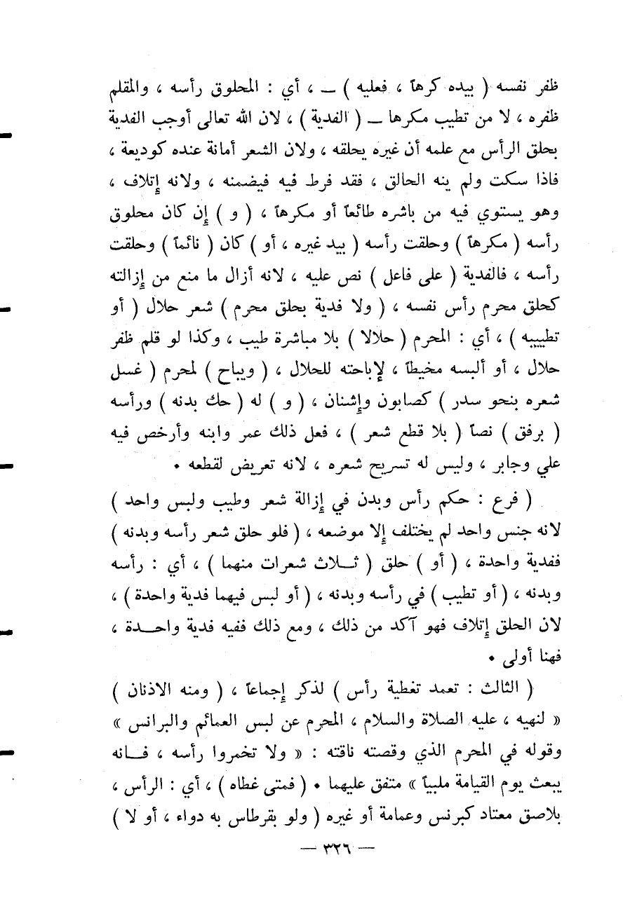 (فَرْعٌ حُكْمُ رَأْسٍ وَبَدَنٍ فِي إزَالَةِ شَعْرٍ وَطِيبٍ وَلِبْسٍ وَاحِدٌ) لِأَنَّهُ جِنْسٌ وَاحِدٌ لَمْ يَخْتَلِفْ إلَّا مَوْضِعُهُ، (فَلَوْ حَلَقَ شَعْرَ رَأْسِهِ وَبَدَنِهِ) فَفِدْيَةٌ وَاحِدَةٌ، (أَوْ) حَلَقَ (ثَلَاثَ شَعَرَاتٍ مِنْهُمَا) ، أَيْ: رَأْسِهِ وَبَدَنِهِ، (أَوْ تَطَيَّبَ) فِي رَأْسِهِ وَبَدَنِهِ، (أَوْ لَبِسَ فِيهِمَا فِدْيَةٌ وَاحِدَةٌ) ؛ لِأَنَّ الْحَلْقَ إتْلَافٌ فَهُوَ آكَدَ مِنْ ذَلِكَ، وَمَعَ ذَلِكَ فَفِيهِ فِدْيَةٌ وَاحِدَةٌ، فَهُنَا أَوْلَى