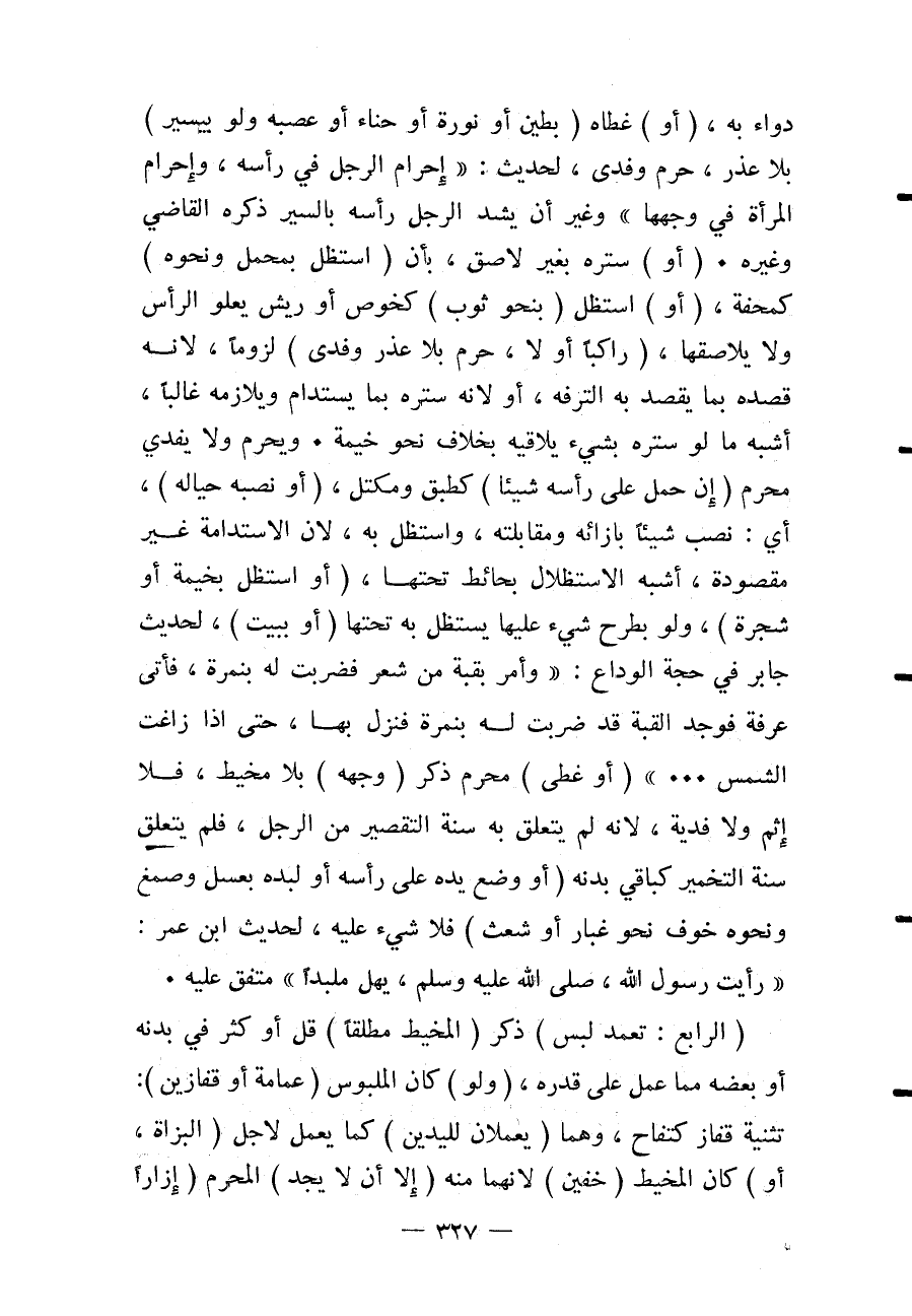 دَوَاءَ بِهِ، (أَوْ) غَطَّاهُ (بِطِينٍ أَوْ نُورَةٍ أَوْ حِنَّاءٍ أَوْ عَصَبَهُ وَلَوْ بِيَسِيرٍ) بِلَا عُذْرٍ، حَرُمَ وَفَدَى؛ لِحَدِيثِ: «إحْرَامُ الرَّجُلِ فِي رَأْسِهِ، وَإِحْرَامُ الْمَرْأَةِ فِي وَجْهِهَا» وَغَيْرَ أَنْ يَشُدَّ الرَّجُلُ رَأْسَهُ بِالسَّيْرِ ذَكَرَهُ الْقَاضِي وَغَيْرُهُ.