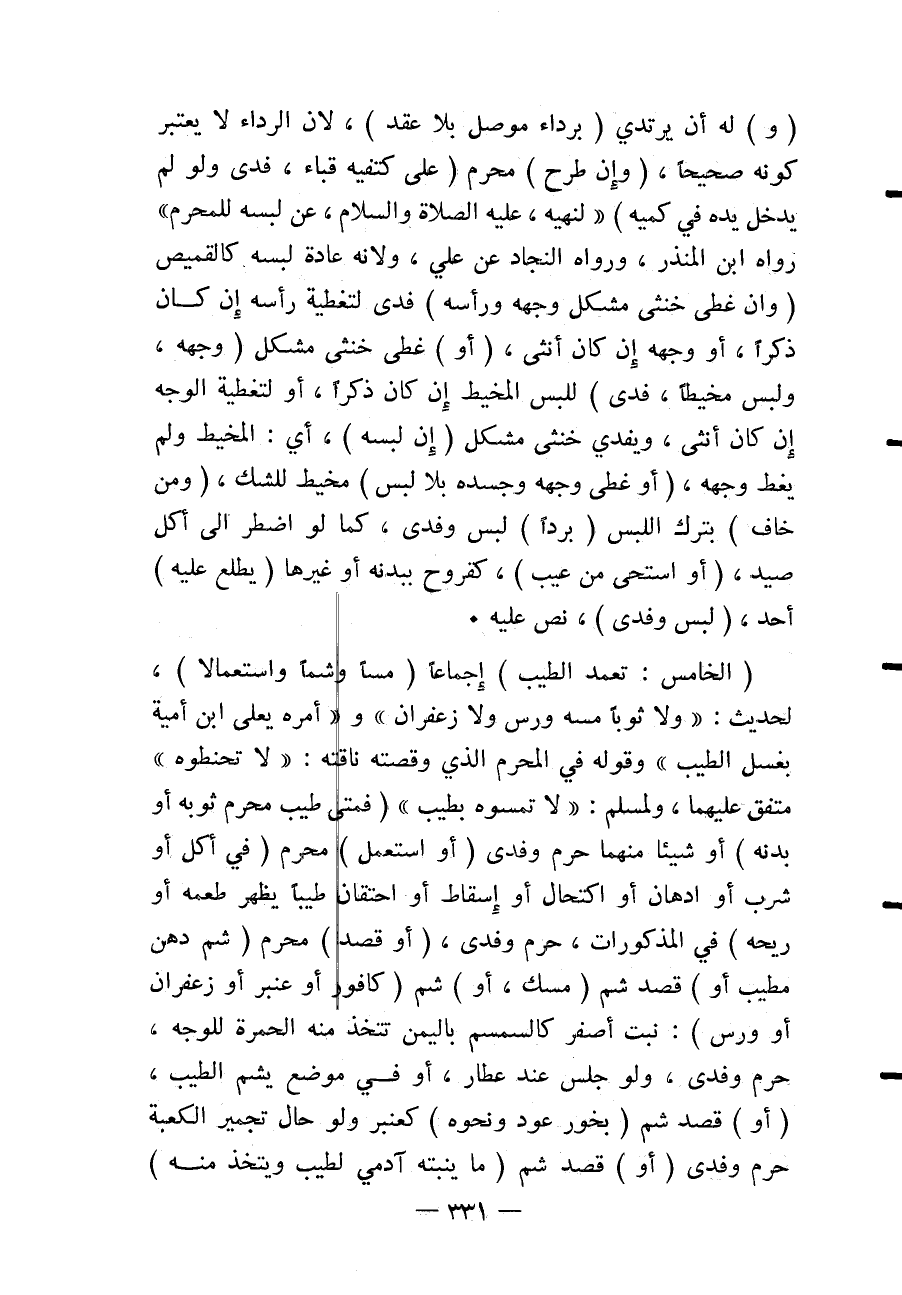 (الْخَامِسُ: تَعَمَّدَ الطِّيبَ) إجْمَاعًا (مَسًّا وَشَمًّا وَاسْتِعْمَالًا) ؛ لِحَدِيثٍ: «وَلَا ثَوْبًا مَسَّهُ وَرْسٌ وَلَا زَعْفَرَانٌ» وَ «أَمْرِهِ يَعْلَى بْنَ أُمَيَّةَ بِغَسْلِ الطِّيبِ» وَقَوْلِهِ فِي الْمُحْرِمِ الَّذِي وَقَصَتْهُ نَاقَتُهُ: «لَا تُحَنِّطُوهُ» مُتَّفَقٌ عَلَيْهِمَا، وَلِمُسْلِمٍ: «لَا تَمَسُّوهُ بِطِيبٍ» (فَمَتَى طَيَّبَ مُحْرِمٌ ثَوْبَهُ أَوْ بَدَنَهُ) أَوْ شَيْئًا مِنْهُمَا حَرُمَ وَفَدَى (أَوْ اسْتَعْمَلَ) مُحْرِمٌ (فِي أَكْلٍ أَوْ شُرْبٍ أَوْ ادِّهَانٍ أَوْ اكْتِحَالٍ أَوْ إسْقَاطٍ أَوْ احْتِقَانٍ طِيبًا يَظْهَرُ طَعْمُهُ أَوْ رِيحُهُ) فِي الْمَذْكُورَاتِ، حَرُمَ وَفَدَى، (أَوْ قَصَدَ) مُحْرِمٌ (شَمَّ دُهْنٍ مُطَيِّبٍ أَوْ) قَصَدَ شَمَّ (مِسْكٍ، أَوْ) شَمَّ (كَافُورٍ أَوْ عَنْبَرٍ أَوْ زَعْفَرَانٍ أَوْ وَرْسٍ) : نَبْتٍ أَصْفَرَ كَالسِّمْسِمِ بِالْيَمَنِ تُتَّخَذُ مِنْهُ الْحُمْرَةُ لِلْوَجْهِ، حَرُمَ وَفَدَى، وَلَوْ جَلَسَ عِنْدَ عَطَّارٍ، أَوْ فِي مَوْضِعٍ يَشَمُّ الطِّيبَ، (أَوْ) قَصَدَ شَمَّ (بَخُورِ عُودٍ وَنَحْوِهِ) كَعَنْبَرٍ وَلَوْ حَالَ تَجْمِيرِ الْكَعْبَةِ حَرُمَ وَفَدَى (أَوْ) قَصَدَ شَمَّ (مَا يُنْبِتُهُ آدَمِيٌّ لِطِيبٍ وَيُتَّخَذُ مِنْهُ)