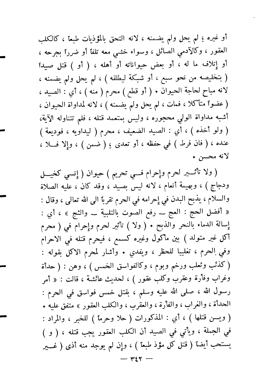 أَوْ غَيْرِهِ؛ لَمْ يَحِلَّ وَلَمْ يَضْمَنْهُ، لِأَنَّهُ الْتَحَقَ بِالْمُؤْذِيَاتِ طَبْعًا، كَالْكَلْبِ الْعَقُورِ، وَكَالْآدَمِيِّ الصَّائِلِ، وَسَوَاءٌ خَشِيَ مَعَهُ تَلَفًا أَوْ ضَرَرًا بِجَرْحِهِ، أَوْ إتْلَافَ مَالِهِ، أَوْ بَعْضَ حَيَوَانَاتِهِ أَوْ أَهْلِهِ، (أَوْ) قَتَلَ صَيْدًا (بِتَخْلِيصِهِ مِنْ نَحْوِ سَبُعٍ، أَوْ شَبَكَةٍ لِيُطْلِقَهُ) ، لَمْ يَحِلَّ وَلَمْ يَضْمَنْهُ؛ لِأَنَّهُ مُبَاحٌ لِحَاجَةِ الْحَيَوَانِ.