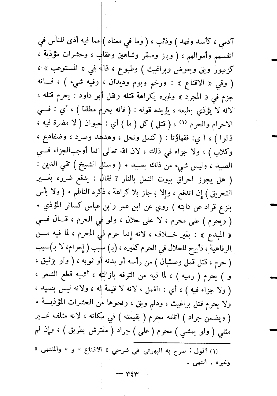 آدَمِيٍّ، كَأَسَدٍ وَفَهْدٍ) وَذِئْبٍ، (وَمَا فِي مَعْنَاهُ) مِمَّا فِيهِ أَذًى لِلنَّاسِ فِي أَنْفُسِهِمْ وَأَمْوَالِهِمْ، (وَبَازٍ وَصَقْرٍ وَشَاهِينِ وَعُقَابٍ، وَحَشَرَاتٍ مُؤْذِيَةٍ، كَزُنْبُورٍ وَبَقٍّ وَبَعُوضٍ وَبَرَاغِيثَ) وَطُبُوعٍ، قَالَهُ فِي " الْمُسْتَوْعِبِ "، (وَفِي " الْإِقْنَاعِ ": وَرَخَمٍ وَبُومٍ وَدِيدَانٍ، وَفِيهِ شَيْءٌ) ، فَإِنَّهُ، جَزَمَ فِي " الْمُجَرَّدِ " وَغَيْرِهِ بِكَرَاهَةِ قَتْلِهِ وَنَقَلَ أَبُو دَاوُد: يَحْرُمُ قَتْلُهُ، لِأَنَّهُ لَا يُؤْذِي بِطَبْعِهِ، يُؤَيِّدُهُ قَوْلُهُ: (فَإِنَّهُ يَحْرُمُ مُطْلَقًا) ، أَيْ: فِي الْإِحْرَامِ وَالْحَرَمِ، (قَتْلُ) كُلِّ (مَا) أَيْ: حَيَوَانٍ (لَا مَضَرَّةَ فِيهِ، قَالُوا) ، أَيْ: فُقَهَاؤُنَا: (كَنَمْلٍ وَنَحْلٍ، وَهُدْهُدٍ وَصُرَدٍ، وَضَفَادِعَ، وَكِلَابٍ) ، وَلَا جَزَاءَ فِي ذَلِكَ؛ لِأَنَّ اللَّهَ - تَعَالَى - إنَّمَا أَوْجَبَ الْجَزَاءَ فِي الصَّيْدِ، وَلَيْسَ شَيْءٌ مِنْ ذَلِكَ بِصَيْدٍ.